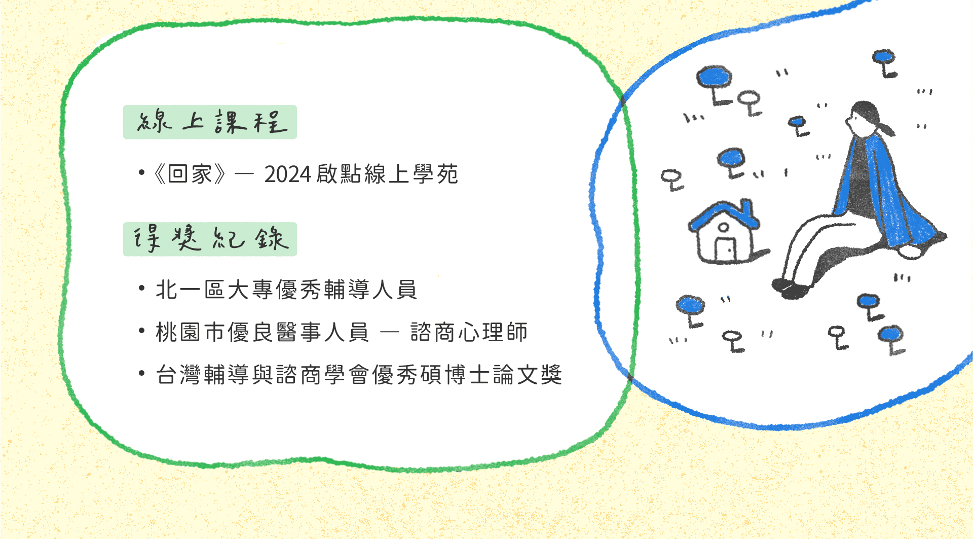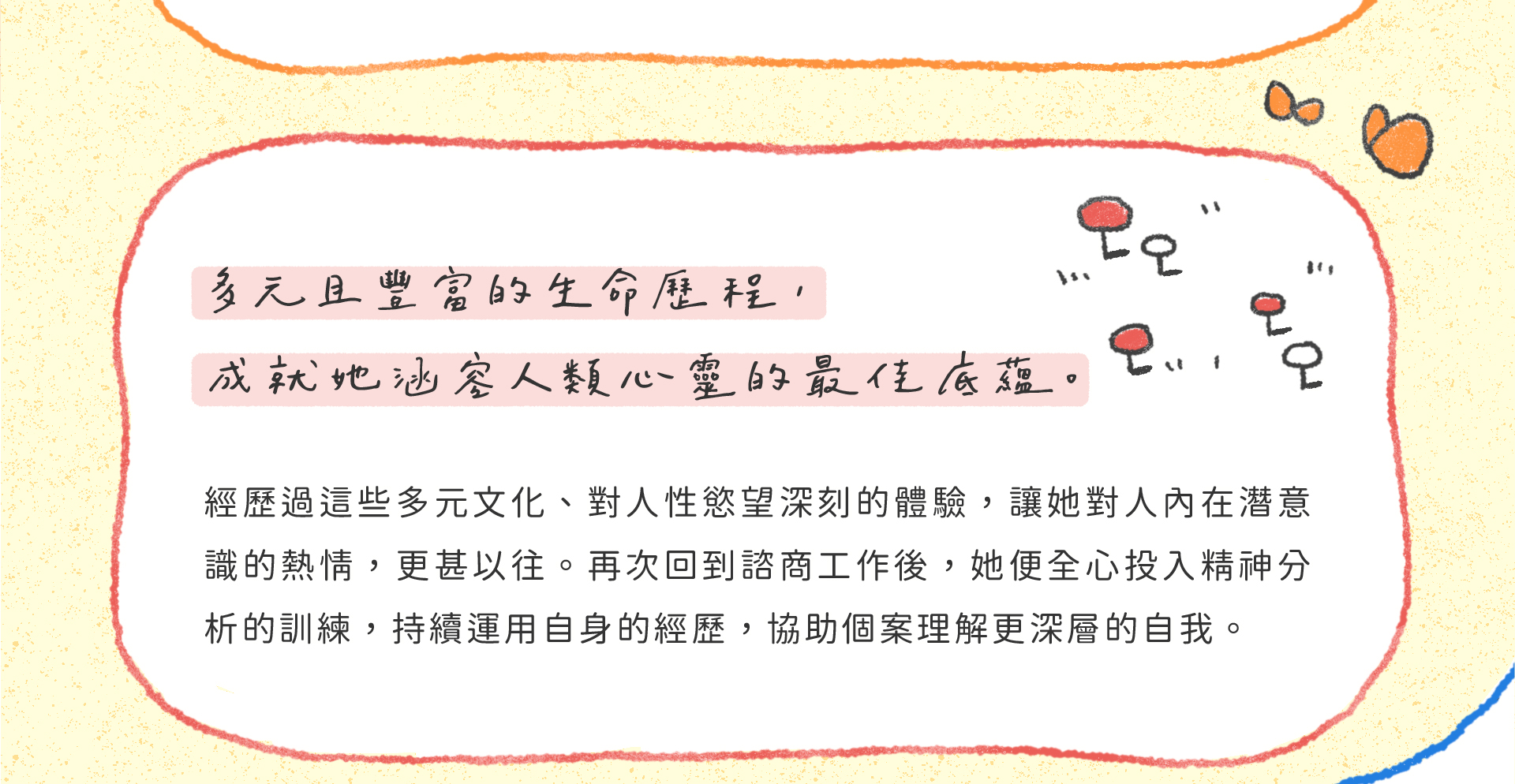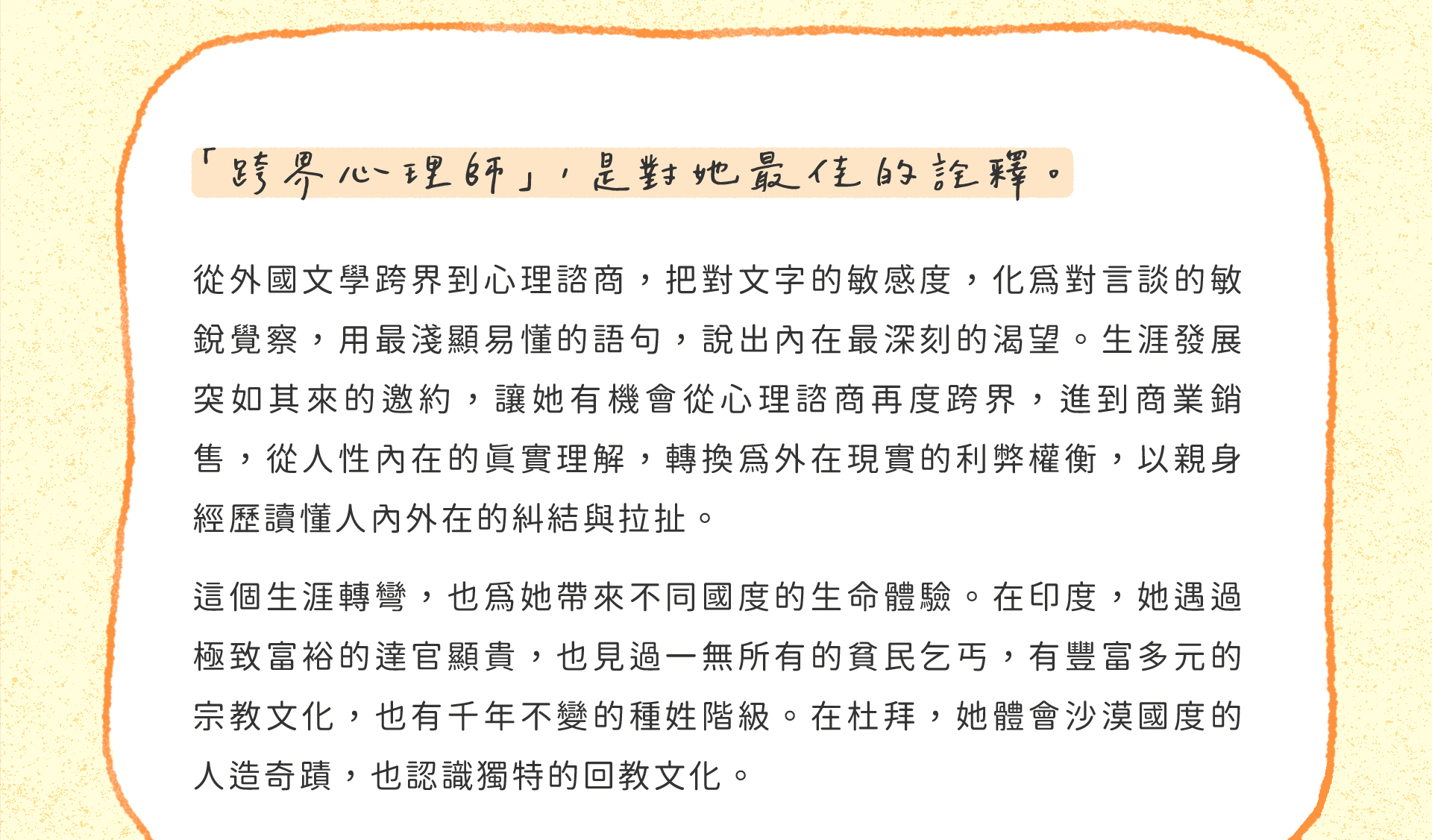 「跨界心理師」,是對她最佳的詮釋。 從外國文學跨界到心理諮商,把對文字的敏感度,化為對言談的敏銳覺察,用最淺顯易懂的語句,說出內在最深刻的渴望。生涯發展突如其來的邀約,讓她有機會從心理諮商再度跨界,進到商業銷售,從人性內在的真實理解,轉換為外在現實的利弊權衡,以親身經歷讀懂人內外在的糾結與拉扯。 這個生涯轉彎,也為她帶來不同國度的生命體驗。在印度,她遇過極致富裕的達官顯貴,也見過一無所有的貧民乞丐,有豐富多元的宗教文化,也有千年不變的種姓階級。在杜拜,她體會沙漠國度的人造奇蹟,也認識獨特的回教文化。 多元且豐富的生命歷程,成就她涵容人類心靈的最佳底蘊。 經歷過這些多元文化、對人性慾望深刻的體驗,讓她對人內在潛意識的熱情,更甚以往。再次回到諮商工作後,她便全心投入精神分析的訓練,持續運用自身的經歷,協助個案理解更深層的自我。