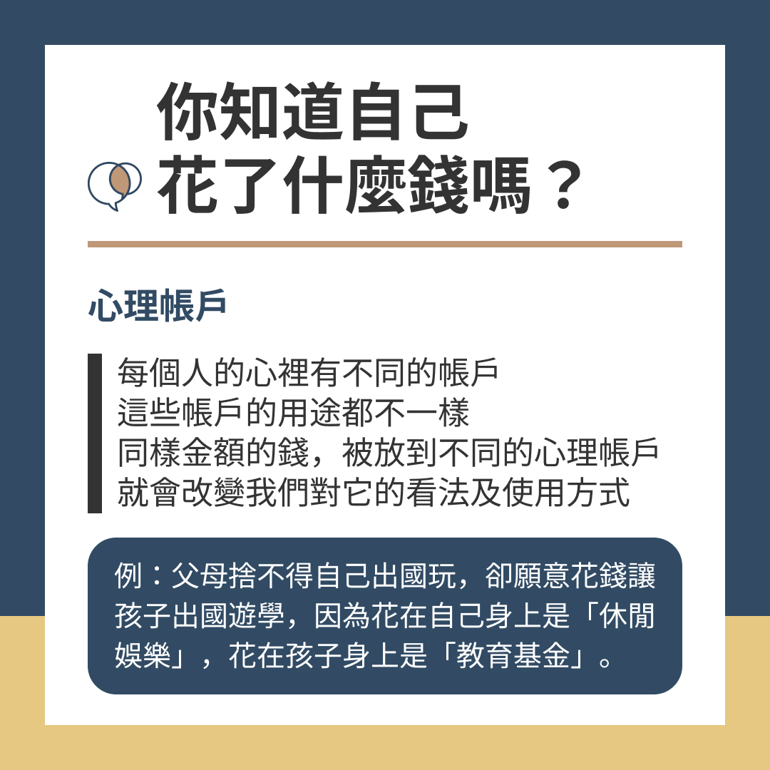 每個人的心裡有不同的帳戶,這些帳戶的用途都不一樣,如:支付生活開銷、休閒娛樂、學習成長。同樣金額的錢,如果被放到不同的心理帳戶,就會改變我們對它的看法及使用方式