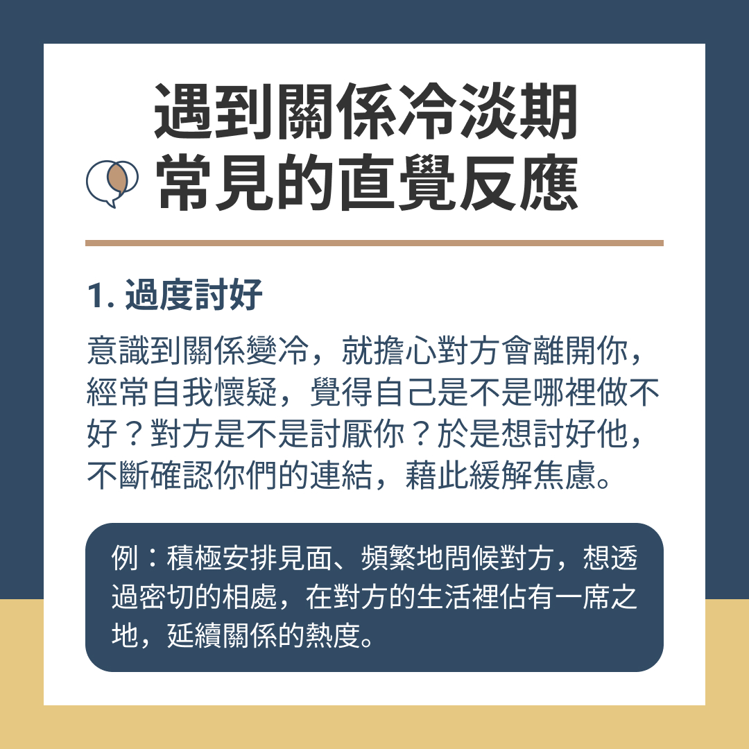 意識到關係變冷,就會擔心對方離開你,經常自我懷疑,覺得自己是不是哪裡做不好?對方是不是討厭你、排斥你?於是很想討好對方,不斷跟對方確認你們的連結,藉此緩解你的焦慮