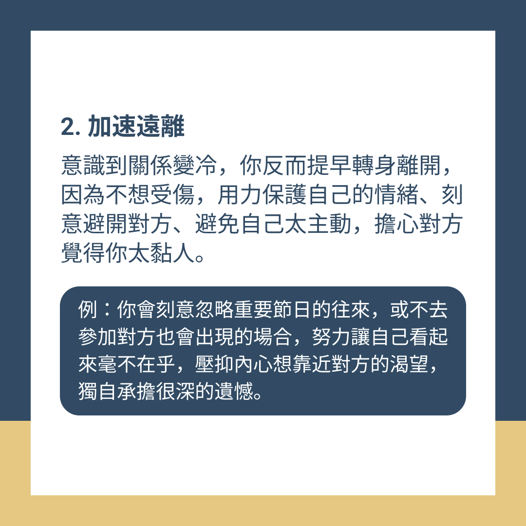 例:你會刻意忽略重要節日的往來,或不去參加對方也會出現的場合,努力讓自己看起來毫不在乎,壓抑內心想靠近對方的渴望,獨自承擔很深的遺憾。