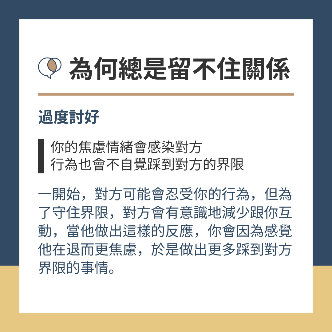 一開始,對方可能會忍受你的行為,但為了守住界限,對方會有意識地減少跟你互動,當他做出這樣的反應,你會因為感覺對方在退而更焦慮,於是做出更多踩到對方界限的事