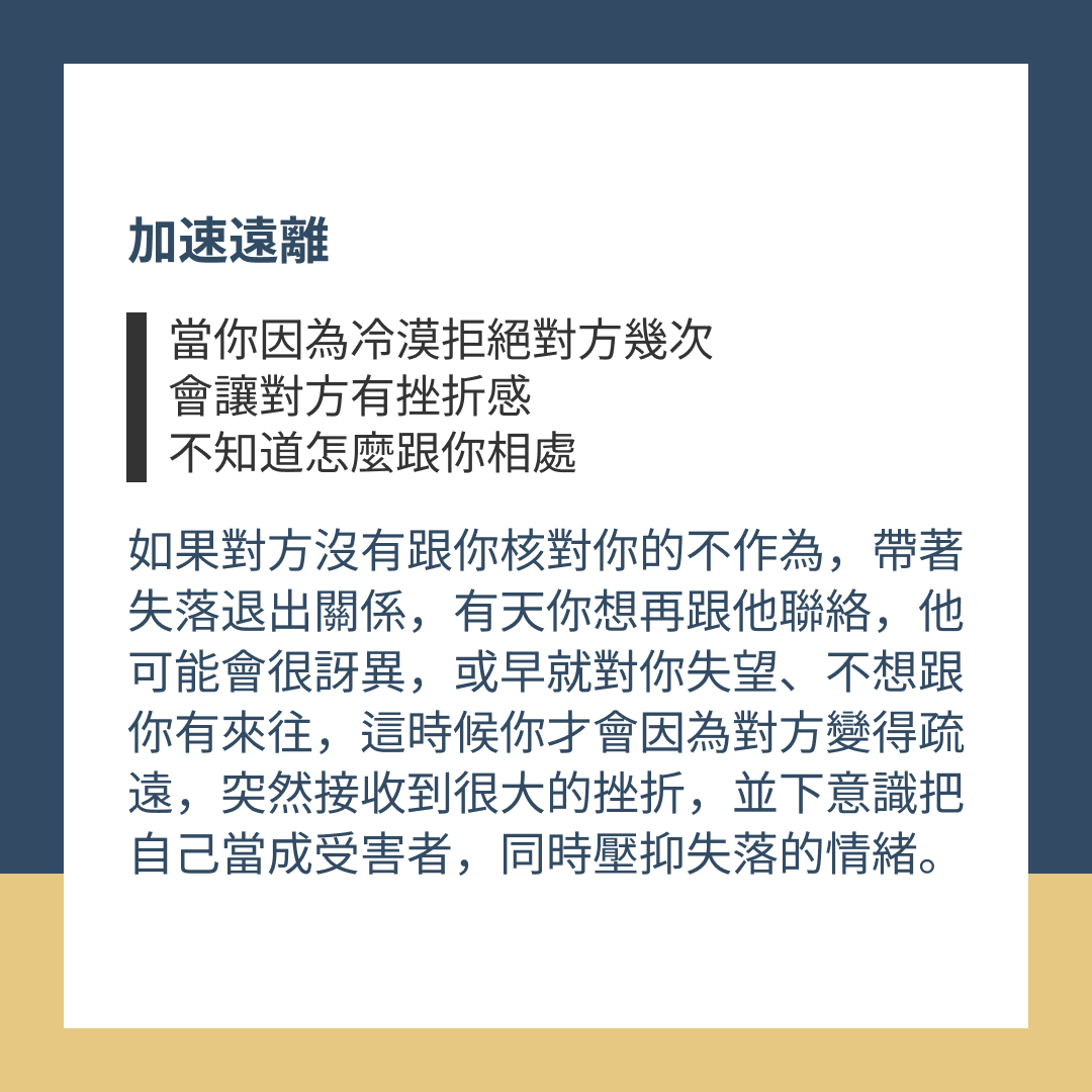 當你因為冷漠拒絕對方幾次,會讓對方有挫折感、不知道怎麼跟你相處