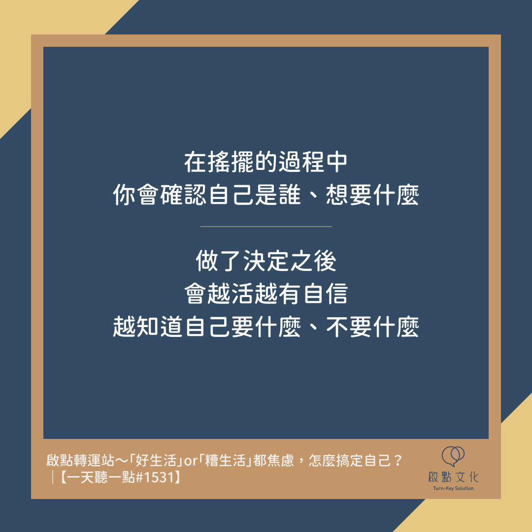 在搖擺的過程中,你會確認自己是誰、想要什麼;做了決定之後,會越活越有自信,越知道自己要什麼、不要什麼