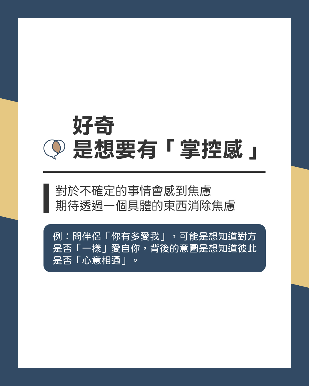 想知道對方是不是「一樣」愛我,背後的意圖是想知道彼此是否「心意相通」