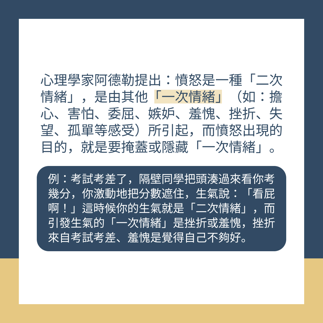 心理學家阿德勒提出:憤怒是一種「二次情緒」,是由其他「一次情緒」(如:擔心、害怕、委屈、嫉妒、羞愧、挫折、失望、孤單等感受)所引起的,而憤怒出現的目的,就是要掩蓋或隱藏「一次情緒」。