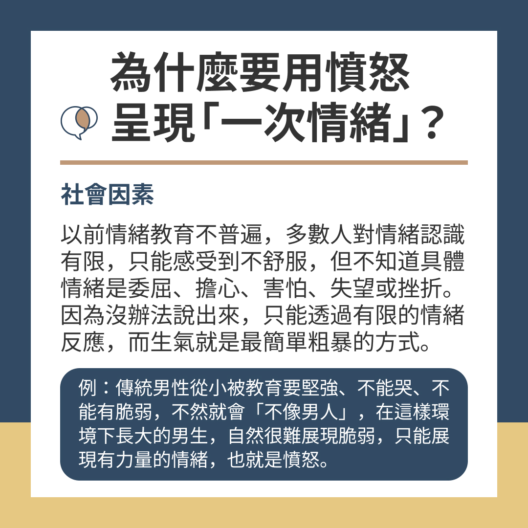 例:傳統男性從小被教育要堅強、不能哭、不能有脆弱,不然就會「不像男人」,在這樣環境下長大的男生,自然很難展現脆弱,只能展現有力量的情緒,也就是憤怒。
