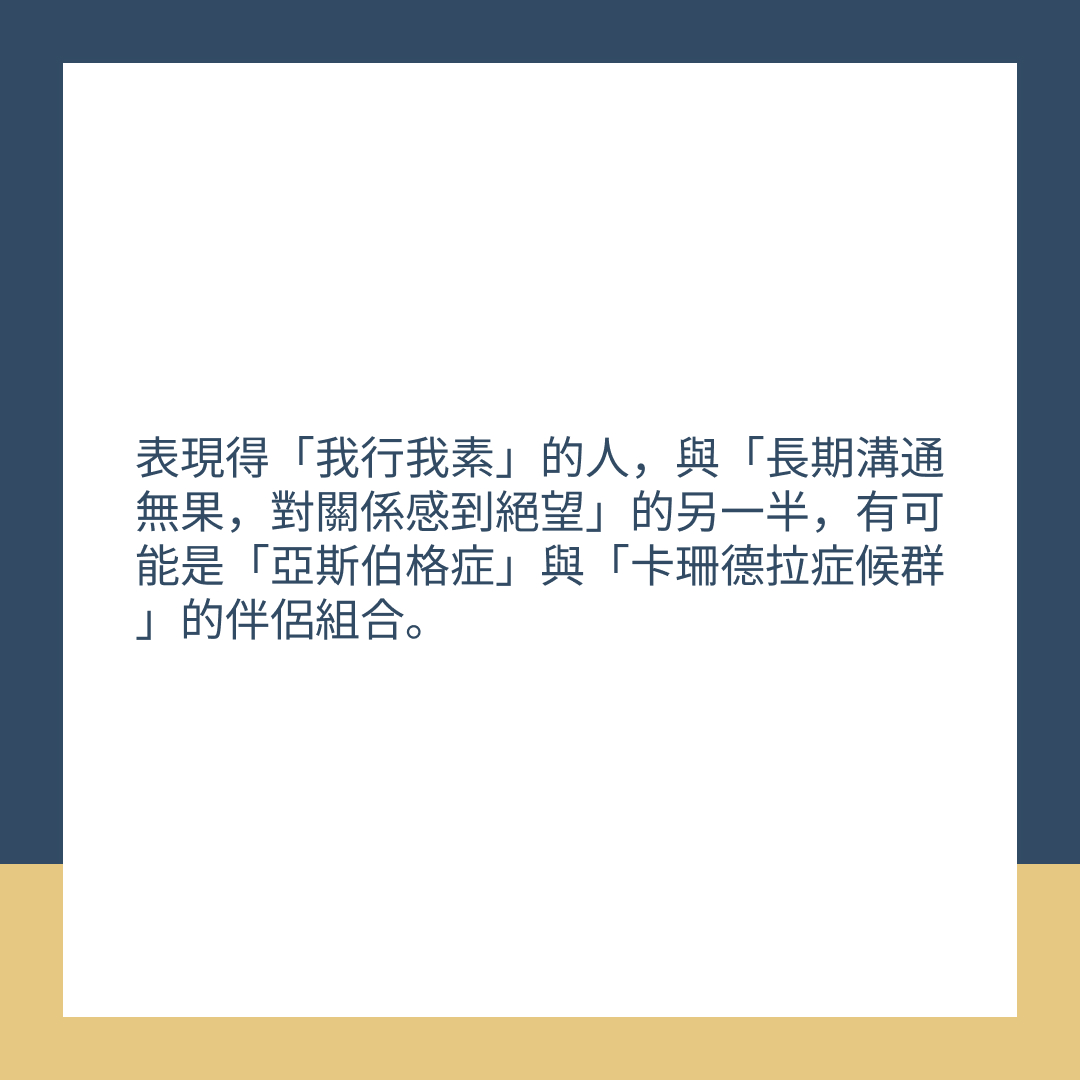表現得「我行我素」的伴侶,與「長期溝通無果,對關係感到絕望」的另一半,有可能是「亞斯伯格症」與「卡珊德拉症候群」的伴侶組合。