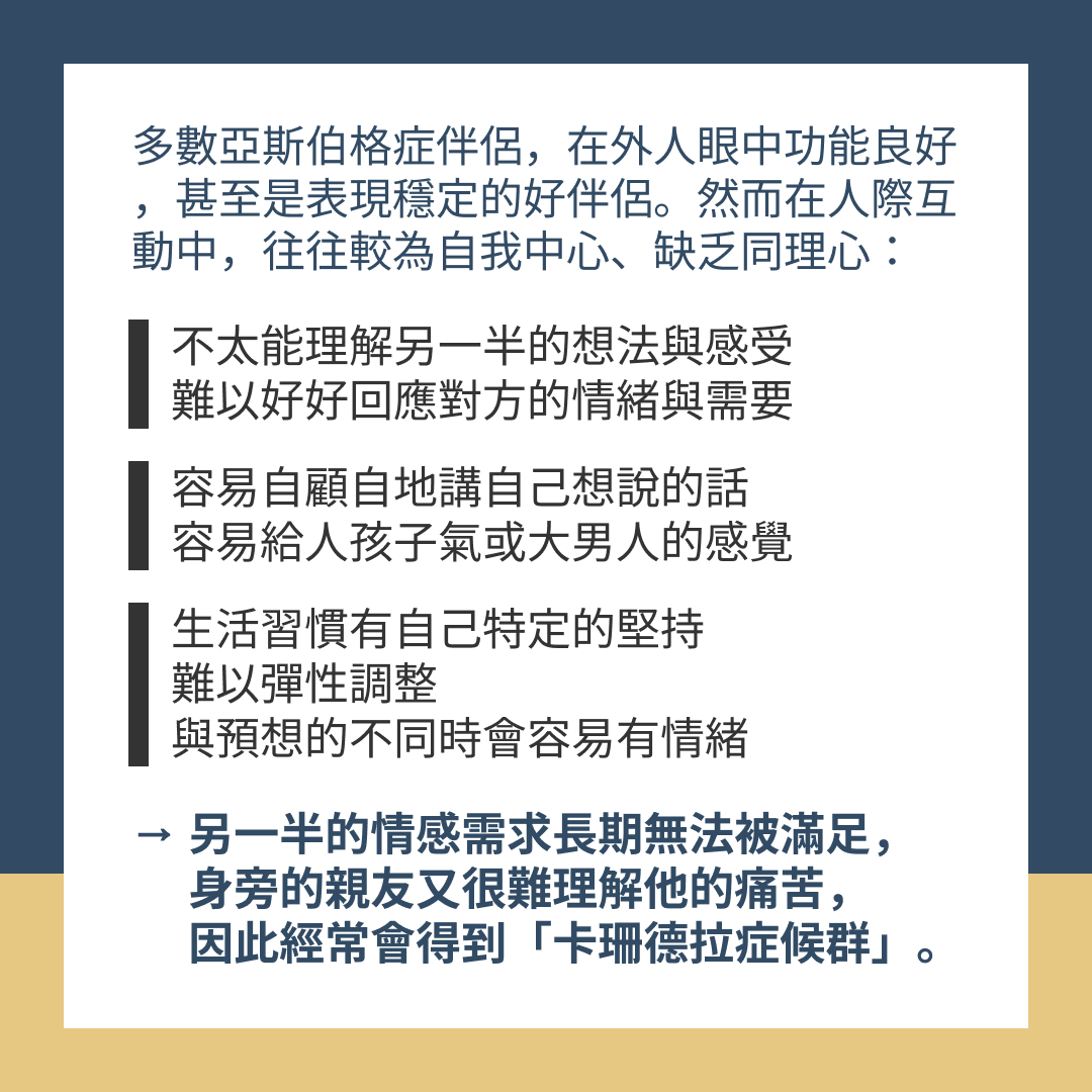 多數亞斯伯格症伴侶在外人眼中功能良好,甚至是表現穩定的好伴侶。然而在人際互動中往往較為自我中心,缺乏同理心: