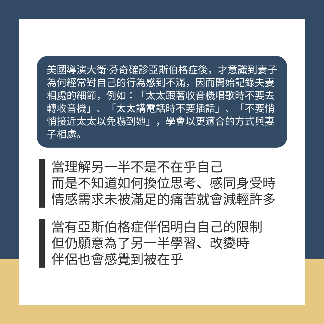 當有亞斯伯格症伴侶明白自己的限制,但仍願意為了另一半學習、改變時,伴侶也會感覺到被在乎