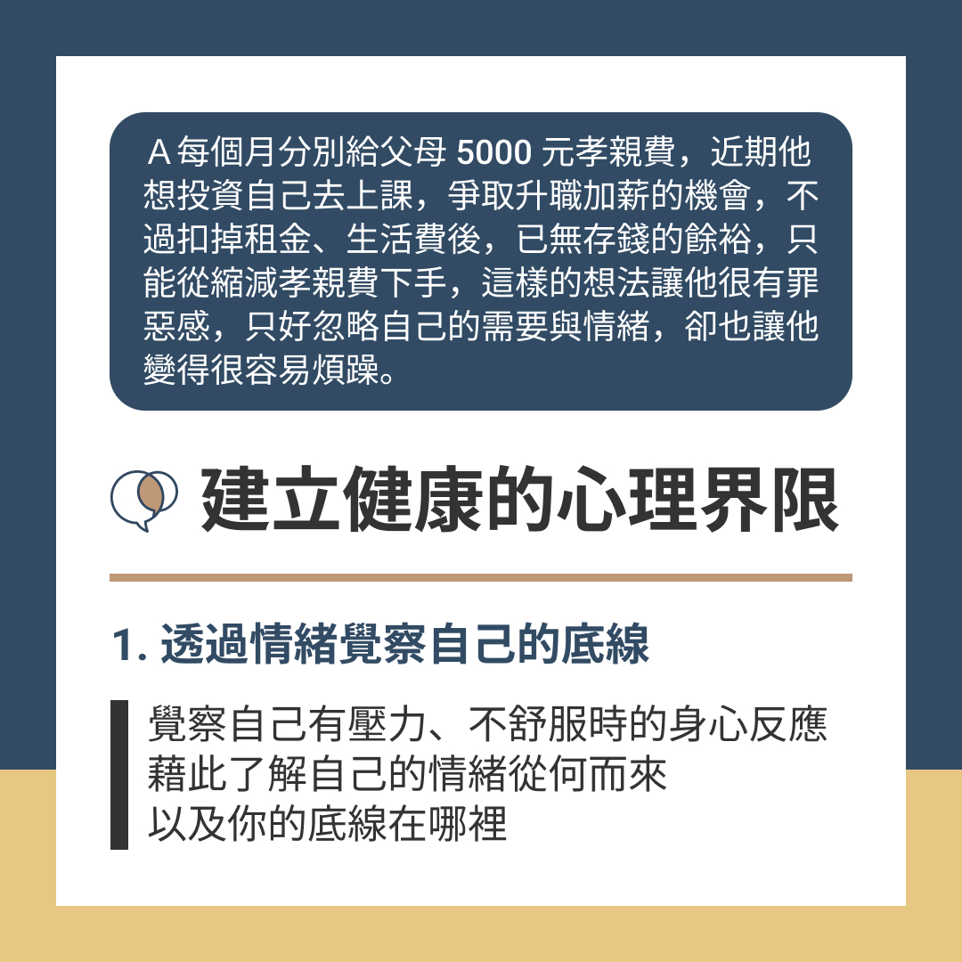 學習建立健康的心理界限後,A終於了解自己的界限以及真心想要,並試著與父母溝通:「我很願意給孝親費,只是工作想升職、加薪,勢必得投資一些錢在學習上。只是以我目前的收入和開銷,加上孝親費,每個月沒有多餘預算可以存錢。所以現階段需要爸媽支持我,原本每月5000元的孝親費,我想暫時給3000元,把2000元留給自己去學習,等到之後有升職、加薪,我再包紅包感謝爸媽。」