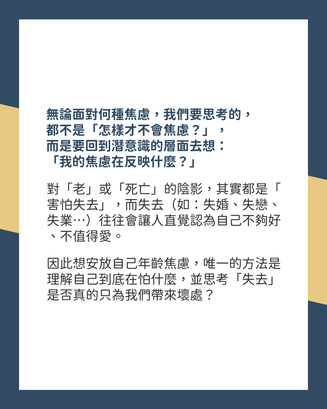 對「老」或「死亡」的陰影,其實都是害怕「失去」,而失去(失婚、失戀、失業…)往往會讓人直覺認為自己不夠好、不值得愛。因此想安放自己年齡焦慮,唯一的方法是理解自己到底在怕什麼,並思考「失去」是否真的只為我們帶來壞處?