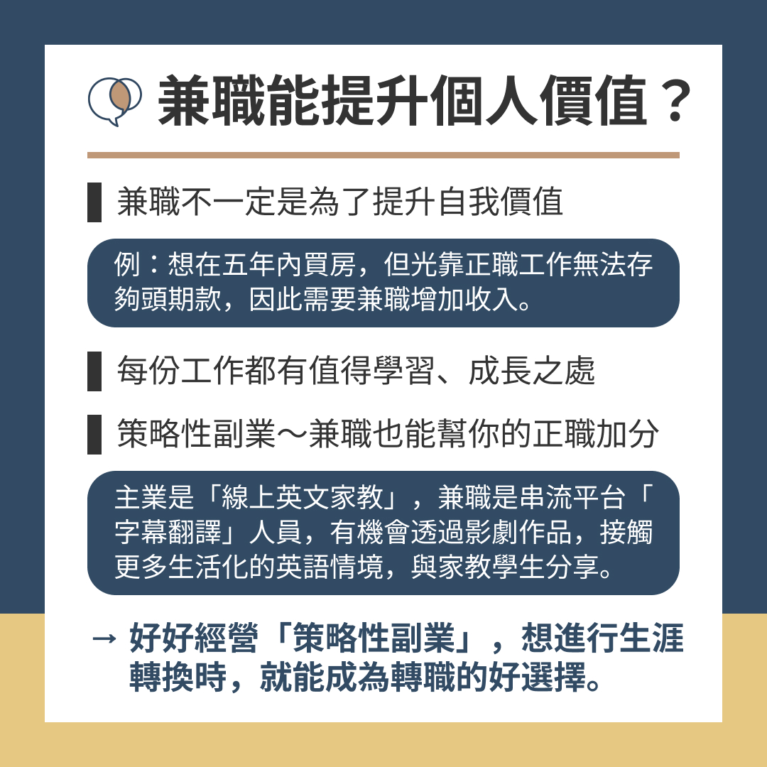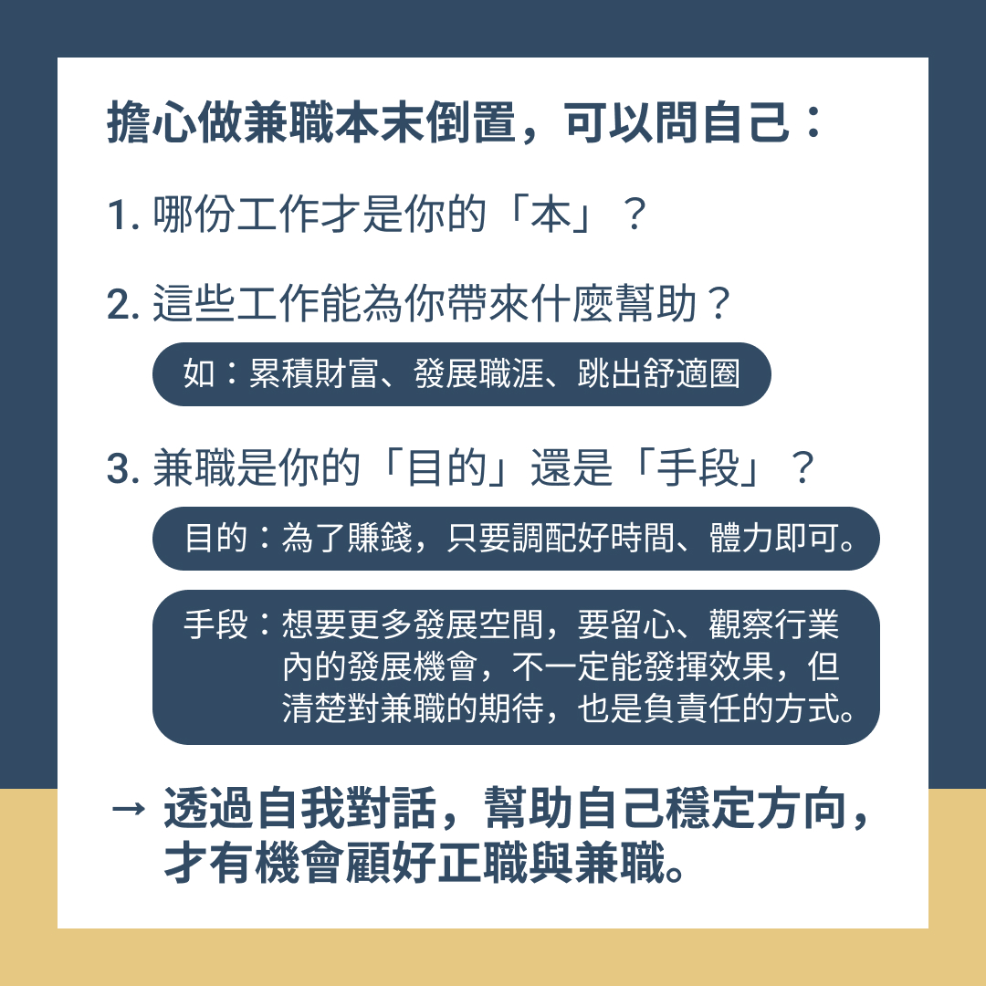 → 透過自我對話,幫助自己穩定方向,才有機會顧好正職與兼職。