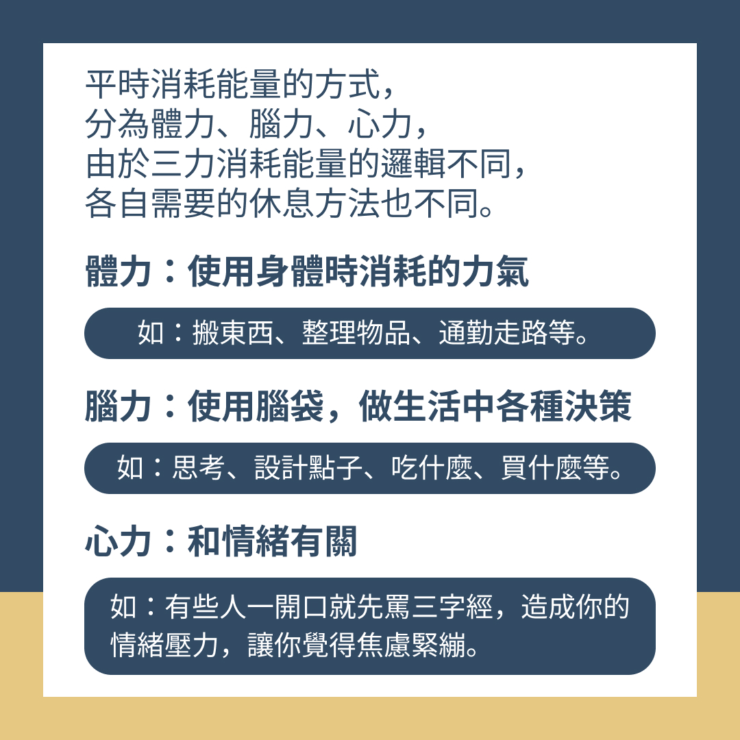 平常消耗能量的方式,分別是體力、腦力、心力,由於三力消耗能量的邏輯不同,各自需要的休息方法也不同。