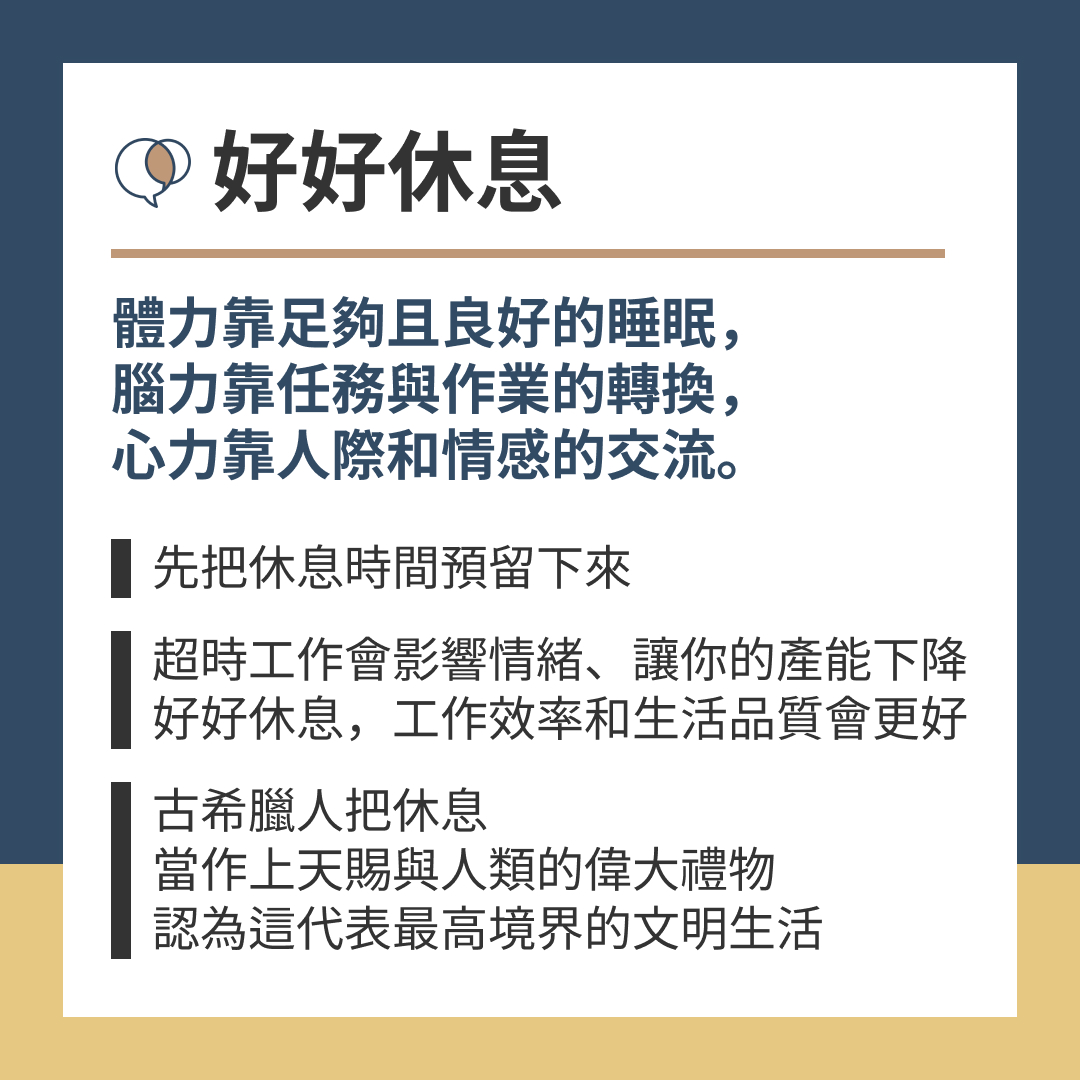 「體力靠足夠且良好的睡眠,腦力靠任務與作業的轉換,心力靠人際和情感的交流。」