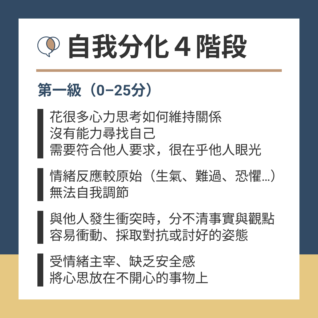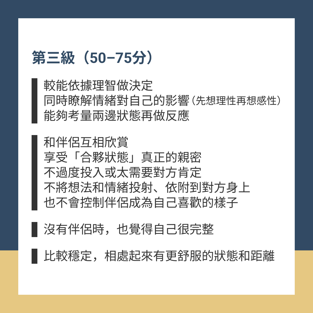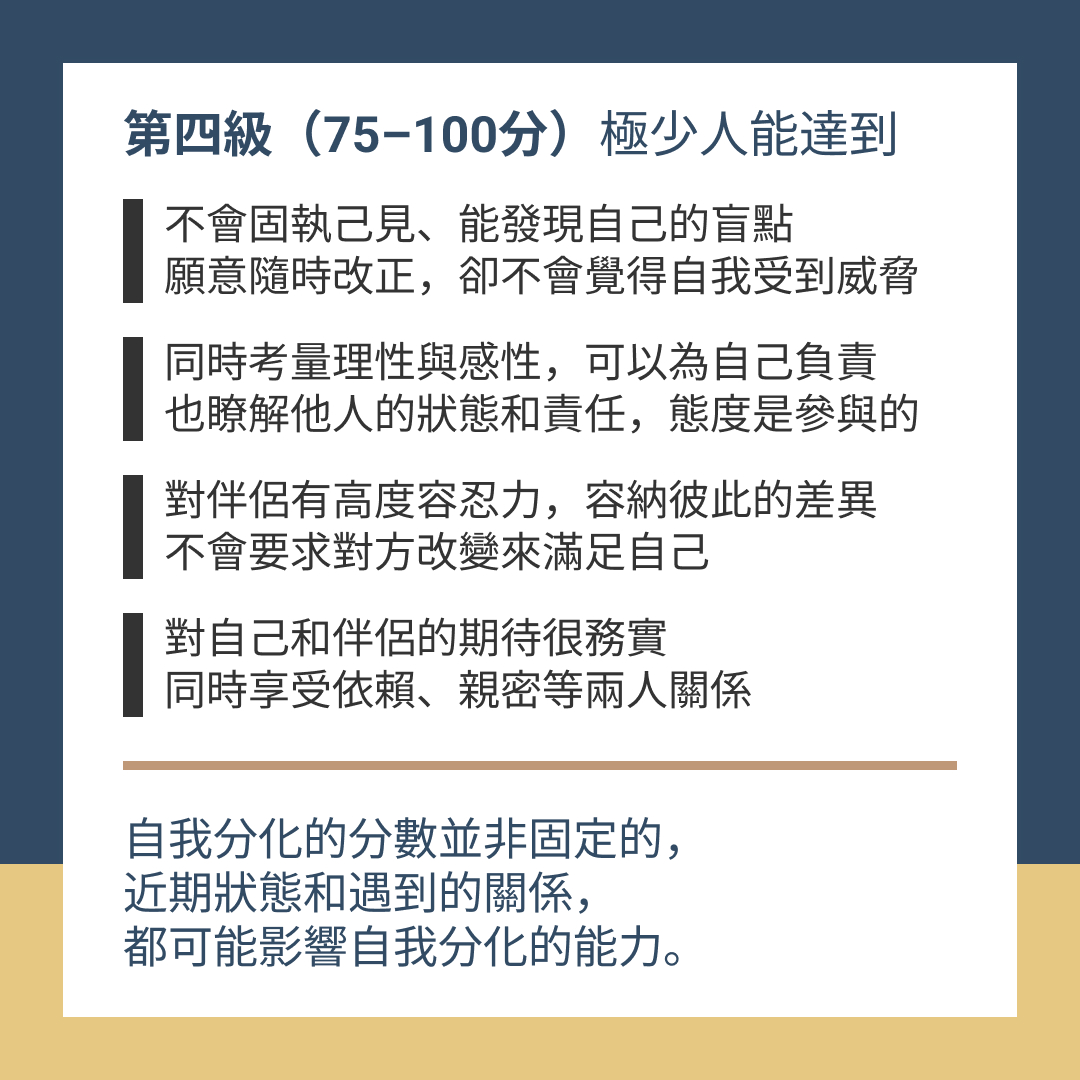 自我分化的分數並非固定的,近期狀態、遇到的關係,都可能影響到自我分化的能力。