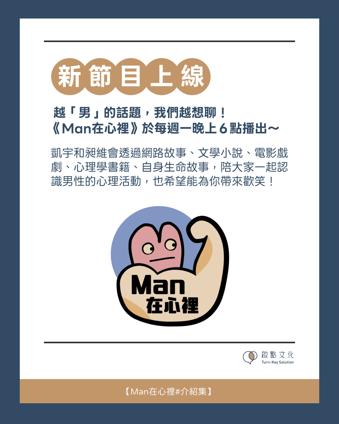 《Man在心裡》將由凱宇和昶維共同主持。有時在認真討論某些議題時,難免會帶點說教的感覺,但請相信我們的出發點始終是善意的,也希望先把這些差異,視為男女之間的差異。若你有任何想法,也都非常歡迎提出來一起討論。