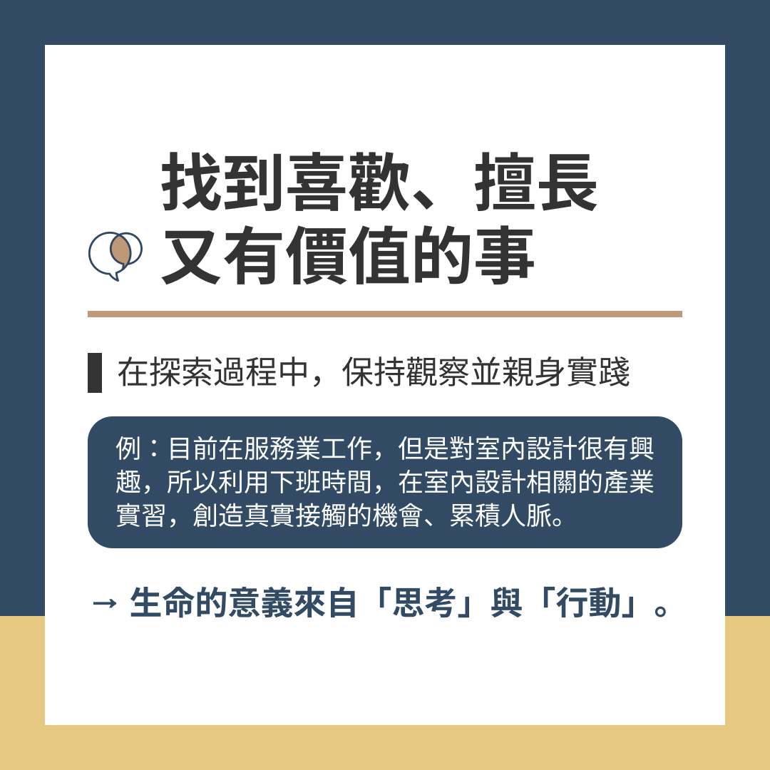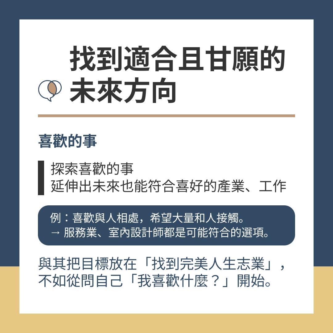 → 與其把目標放在「找到完美的人生志業」,不如從問自己「我喜歡什麼?」開始。