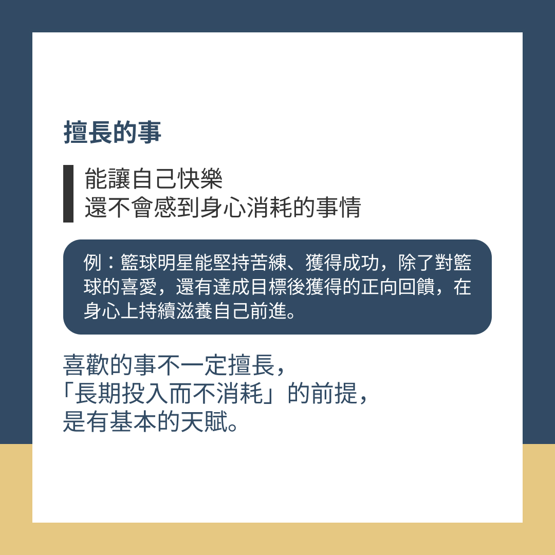 → 喜歡的事不一定擅長,「長期投入而不消耗」的前提,是有基本的天賦。