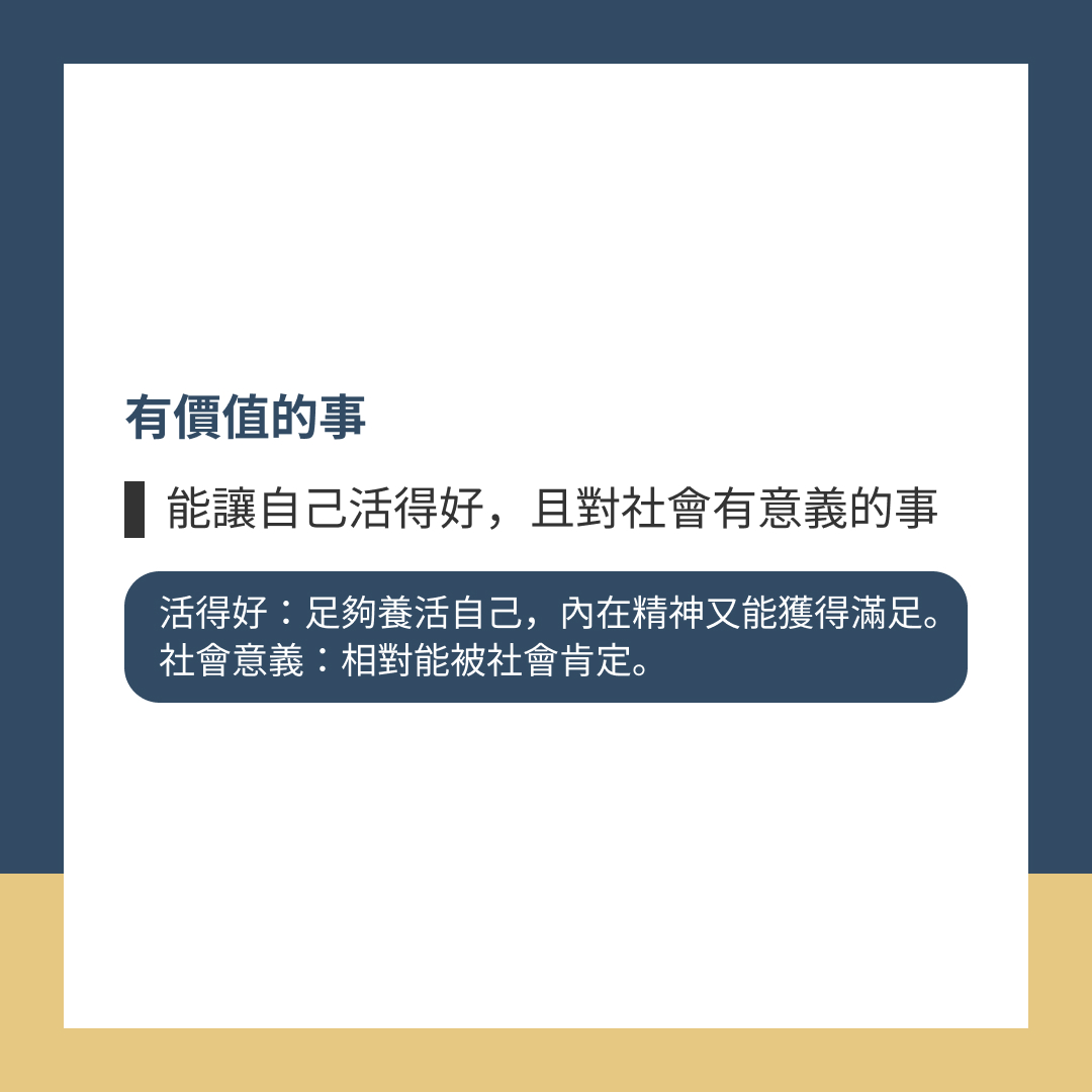 活得好:賺的錢足夠養活自己,內在精神又能獲得滿足/社會意義:相對能被社會肯定。
