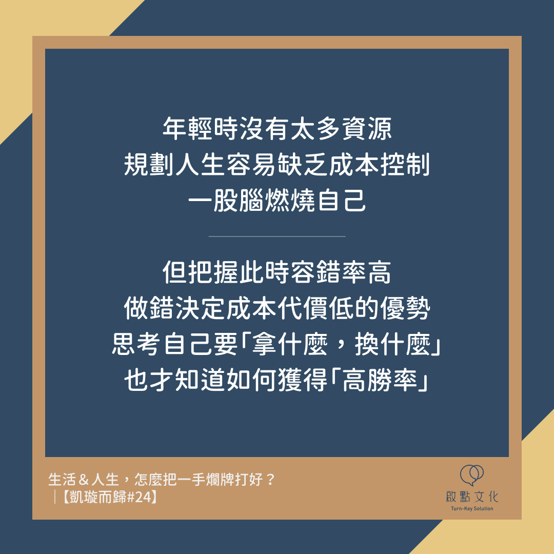 - 年輕時沒有太多資源,規劃人生容易缺乏成本控制、一股腦燃燒自己,但把握此時容錯率高、做錯決定成本代價低的優勢,思考自己要「拿什麼,換什麼」,也才知道如何獲得「高勝率」