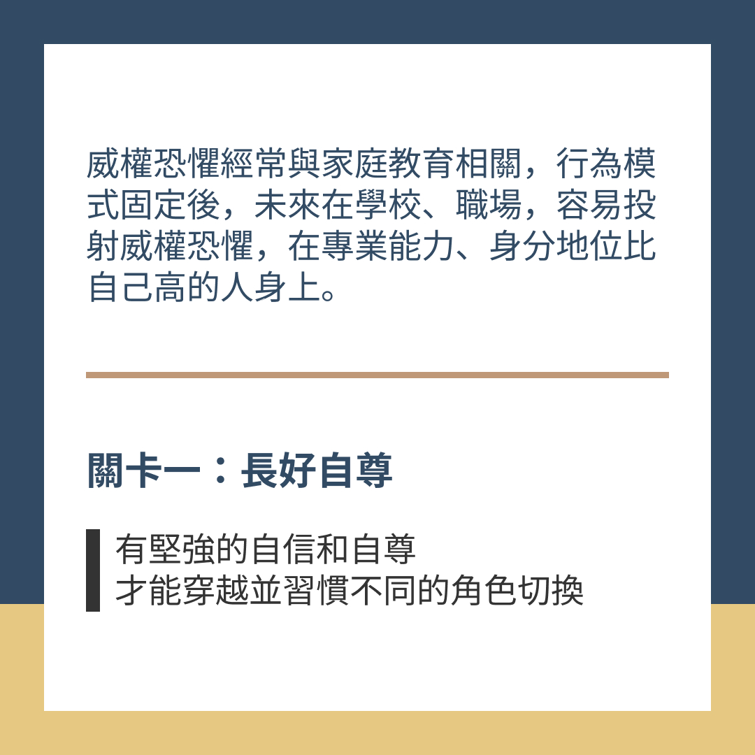 威權恐懼經常與家庭教育相關,行為模式固定後,未來在學校、職場,容易投射威權恐懼,在專業能力、身分地位比自己高的人身上。