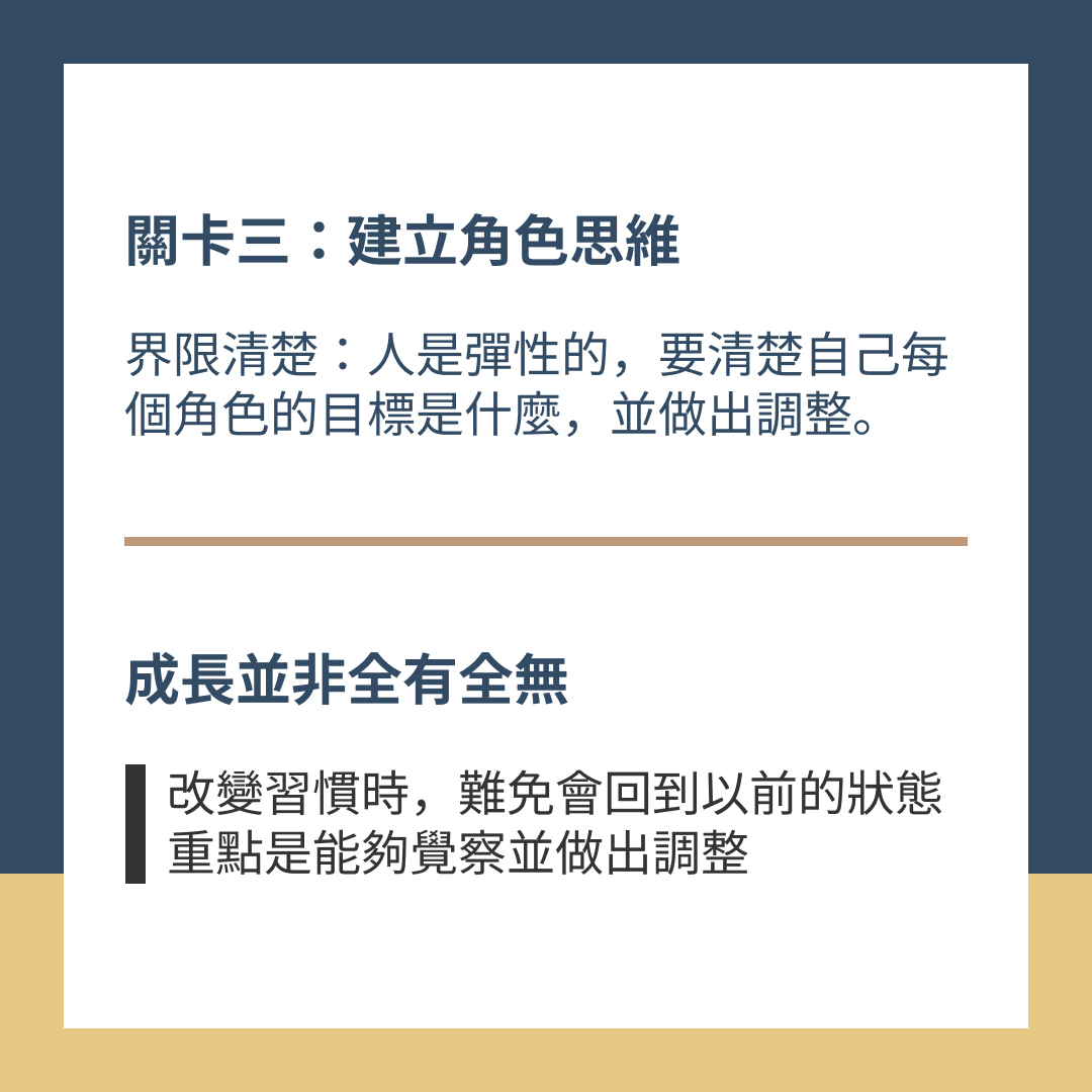 界限清楚:人是彈性的,清楚自己每個角色的目標是什麼,並做出調整