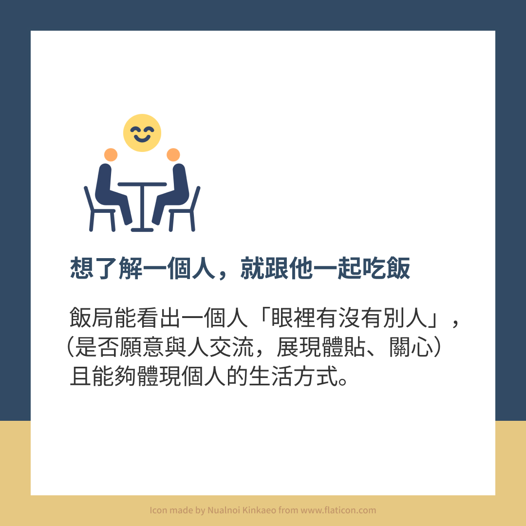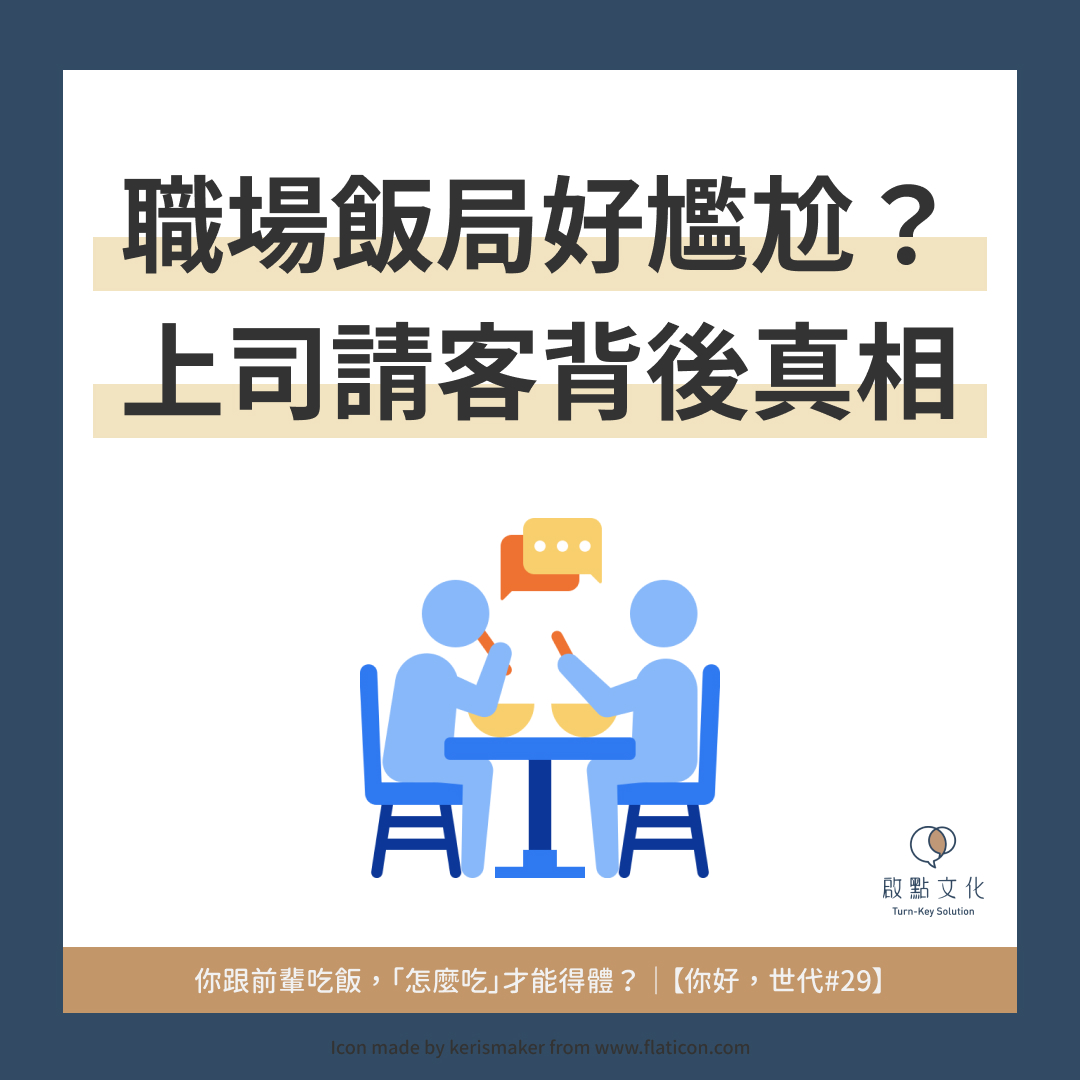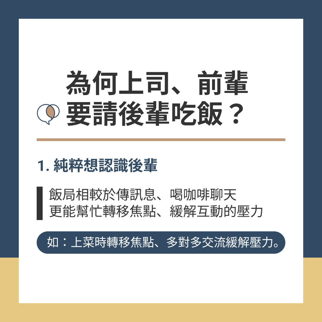 - 當上司、前輩請吃飯,可以回到脈絡理解,問問自己:「為什麼會有這個飯局?」
