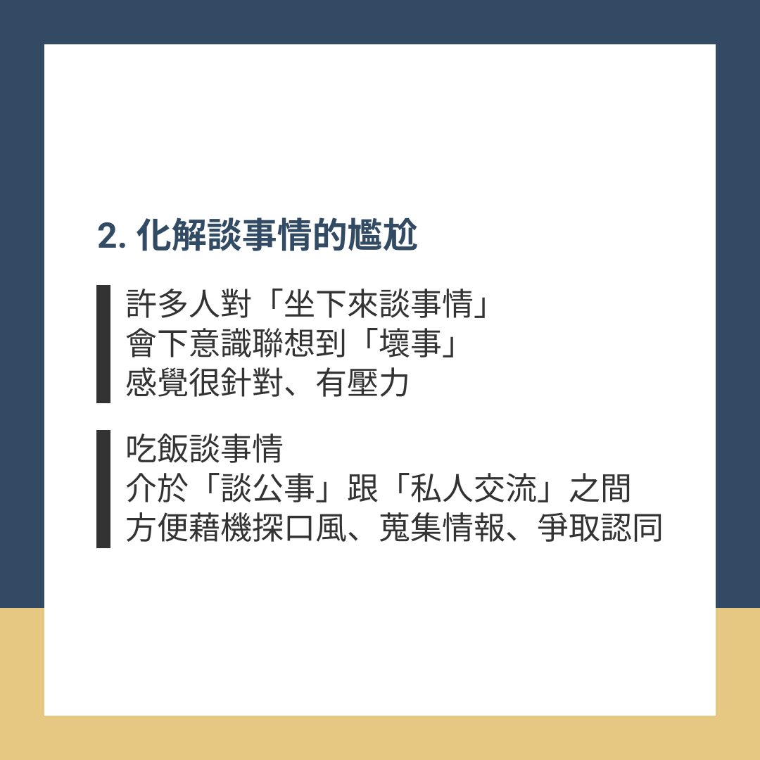 吃飯談事情,介於純粹「談公事」跟「私人交流」間的模糊地帶,方便藉機探口風、蒐集情報、爭取認同