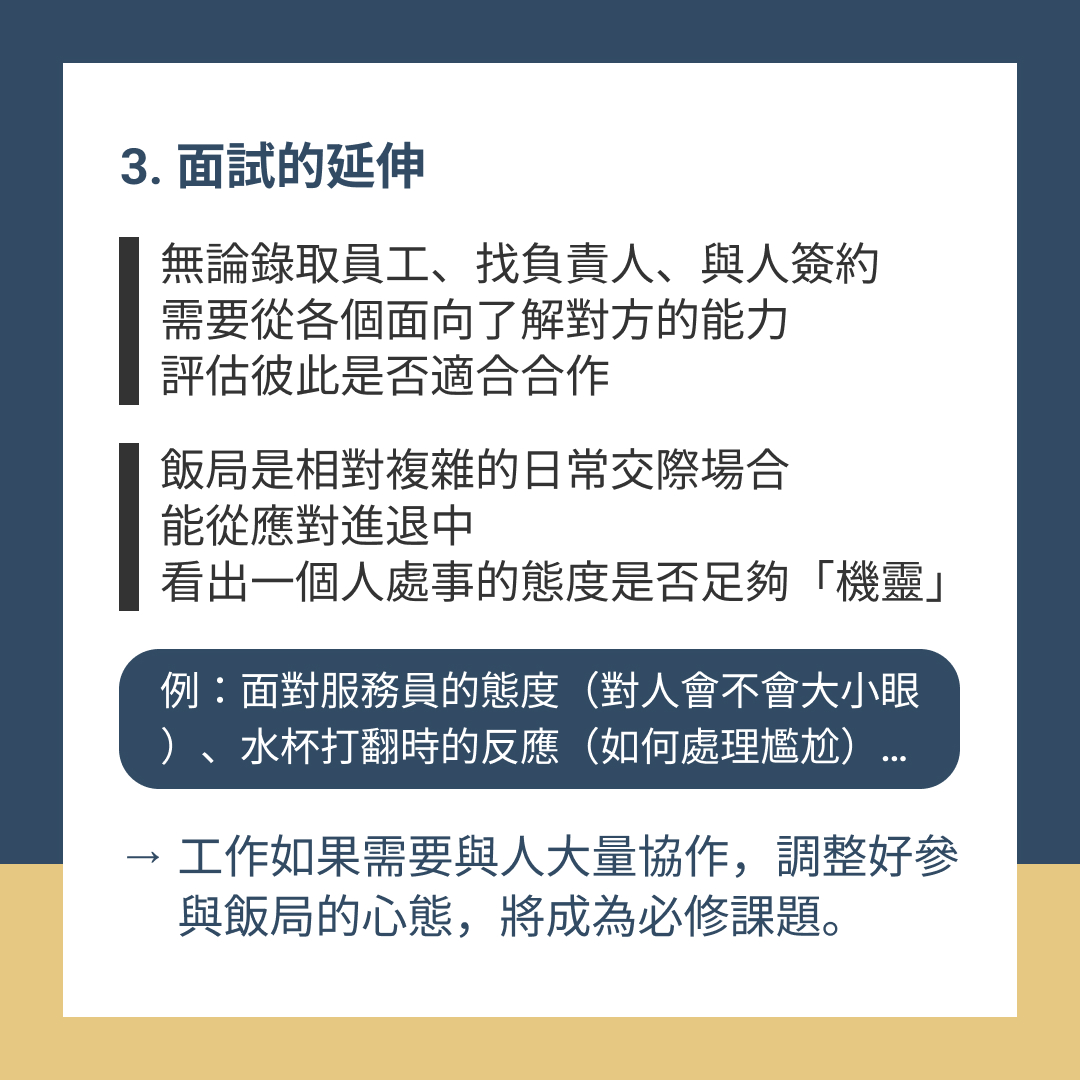 如果飯局是「面試的延伸」(如:評估你是否適任主管),記得「把人放在第一位」,已經認同你能力的上司、前輩,能藉此進一步看見你「對人的細膩度」,評估你在協作事務上,能否達到政通人和