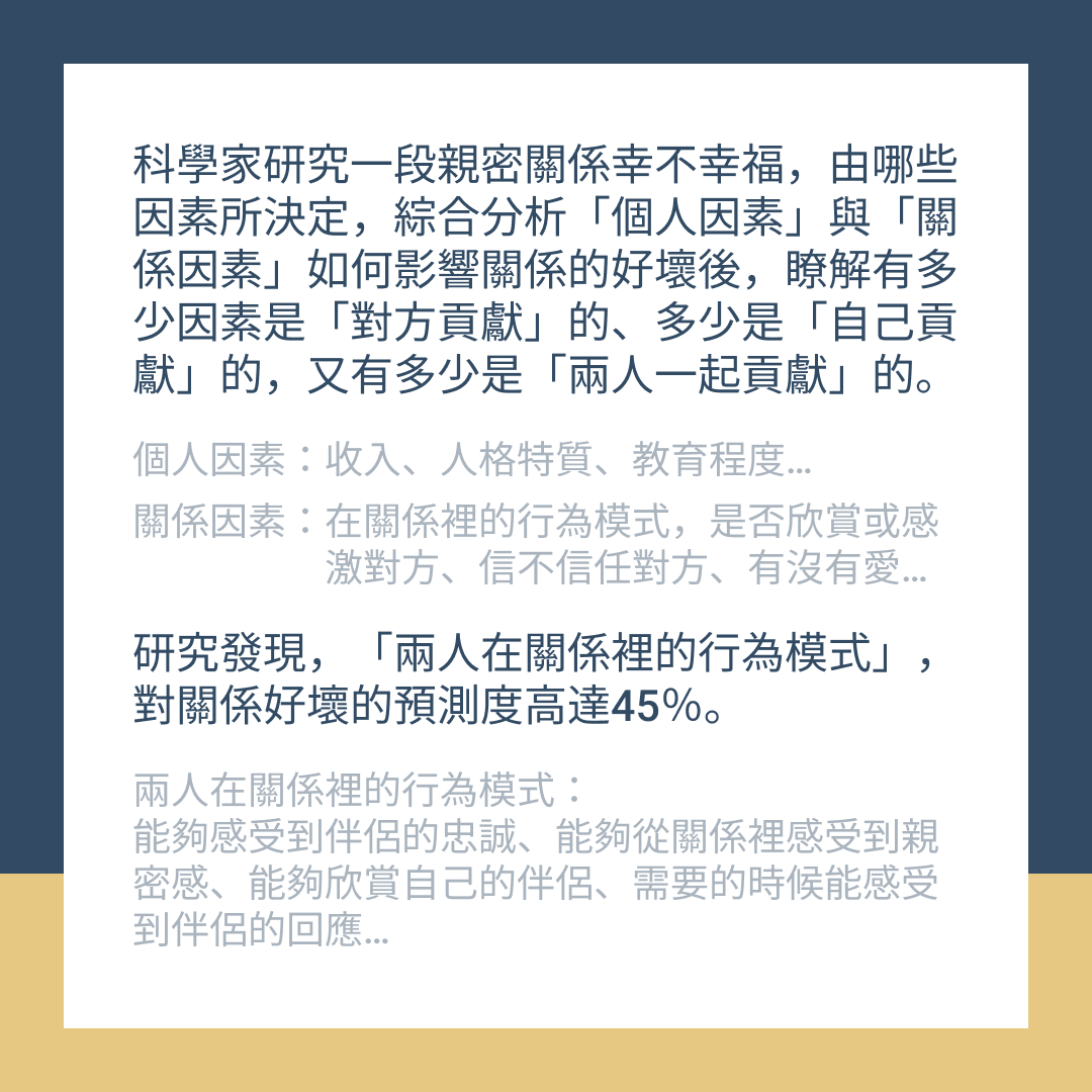 研究發現,「伴侶個人因素」對關係好壞的預測度只有5%;「自己的個人因素」對關係好壞的預測度則有19%(預測度排名前幾的個人因素:對生活的滿意度、是不是經常會有負面情緒、依附類型、自尊);而對關係影響最大的,是「兩人在關係裡的行為模式」(如:「能夠感受到伴侶的忠誠」、「能夠從關係裡感受到親密感」、「能夠欣賞自己的伴侶」、「當需要的時候,能感受到伴侶的回應」等),對關係好壞的預測度高達45%。