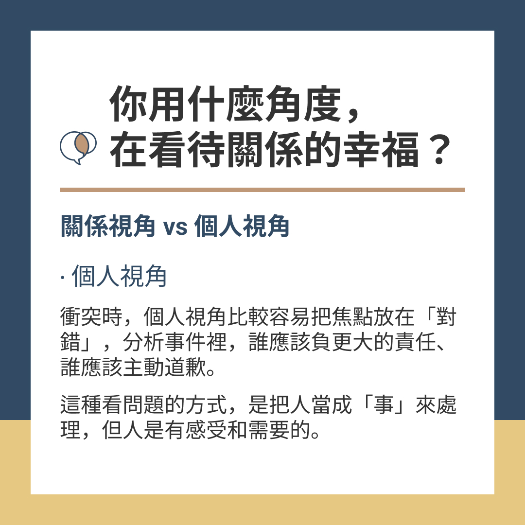 衝突時,個人視角比較容易把焦點放在「對錯」,分析事件裡,誰應該負更大的責任、誰應該主動道歉。這種看問題的方式,是把人當成「事」來處理,但人是有感受和需要的