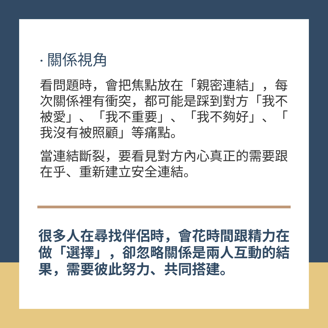關係視角看問題,會把焦點放在「親密連結」,每次關係裡有衝突,都可能是踩到對方「我不被愛」、「我不重要」、「我不夠好」、「我沒有被照顧」等痛點,當連結斷裂,要看見對方內心真正的需要跟在乎、重新建立安全連結