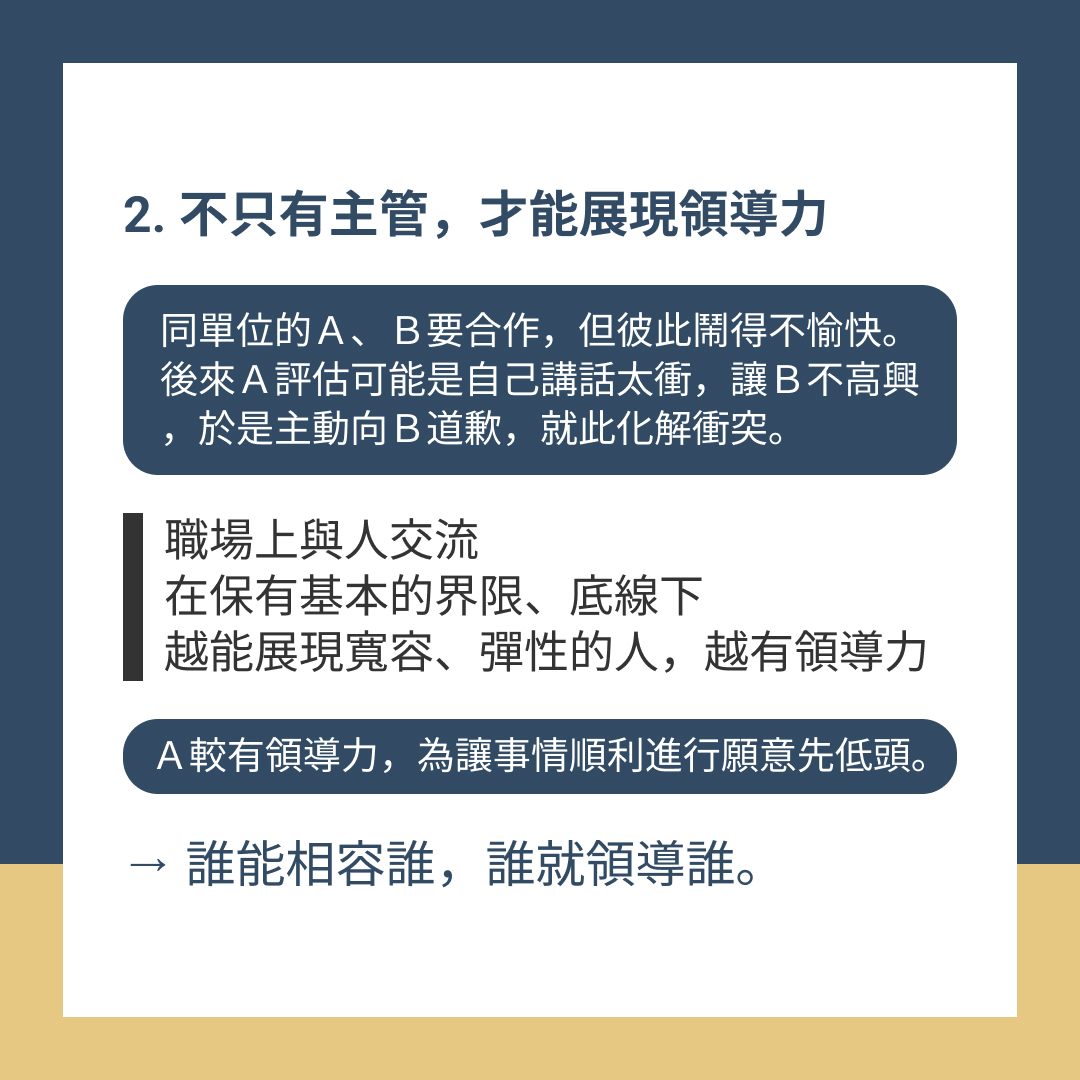 職場上與人交流,在保有基本的界限、底線下,越能展現寬容、彈性的人,越有領導力