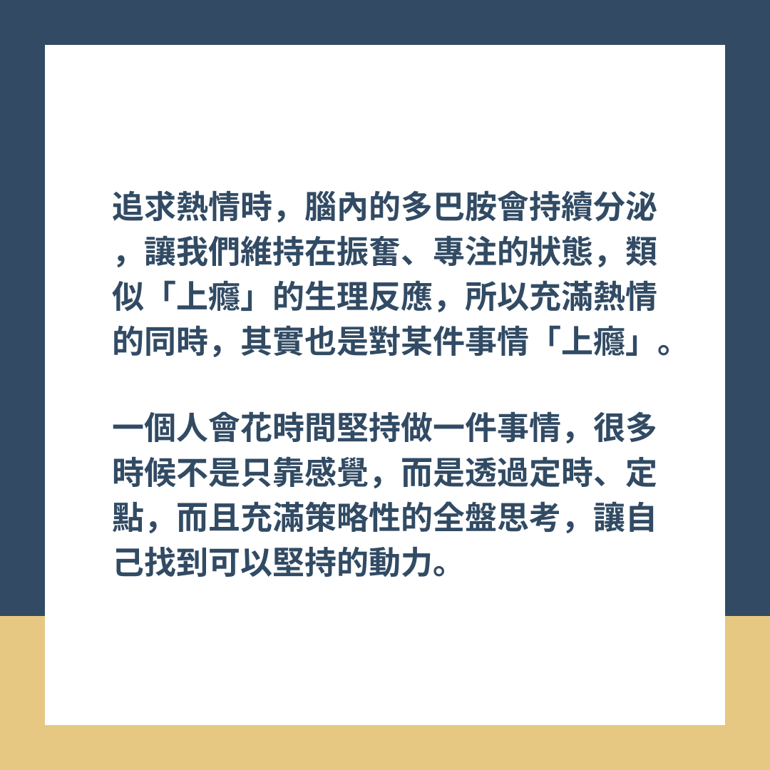 追求熱情時,腦內的多巴胺會持續分泌,讓我們維持在振奮、專注的狀態,這種狀態類似「上癮」的生理反應,所以充滿熱情的同時,其實也是對某件事情「上癮」。