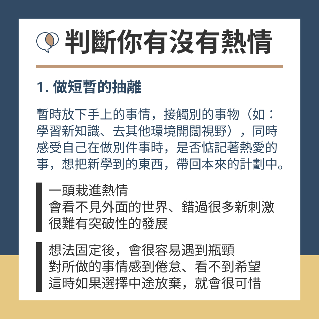 暫時放下手上的事情,去接觸別的事物(如:學習新知識、去其他環境開闊視野),同時感受自己在做別件事情時,是否仍惦記著你熱愛的事,想把新學到的東西,帶回本來的計劃中。