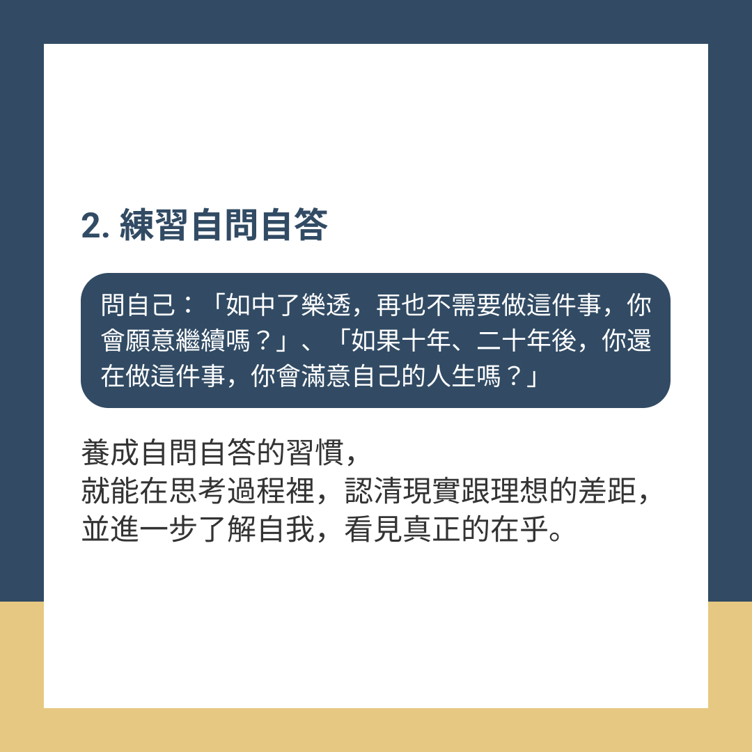 例:問自己「如中了樂透,再也不需要做這件事,你會願意繼續嗎?」、「如果十年、二十年後,你還在做這件事,你會滿意自己的人生嗎?」