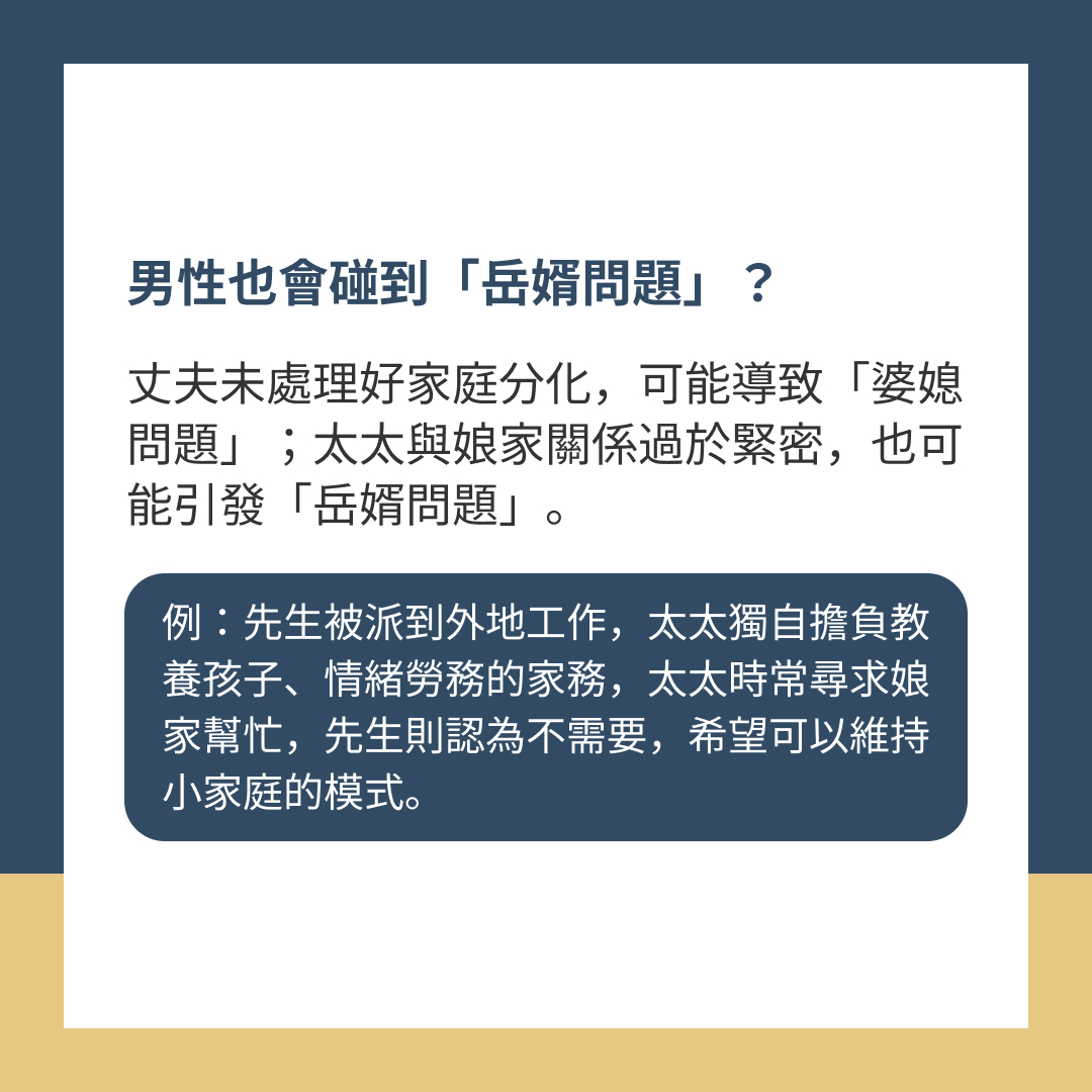 丈夫未處理好家庭分化,可能導致「婆媳問題」;太太與娘家關係過於緊密,也可能引發「岳婿問題」。