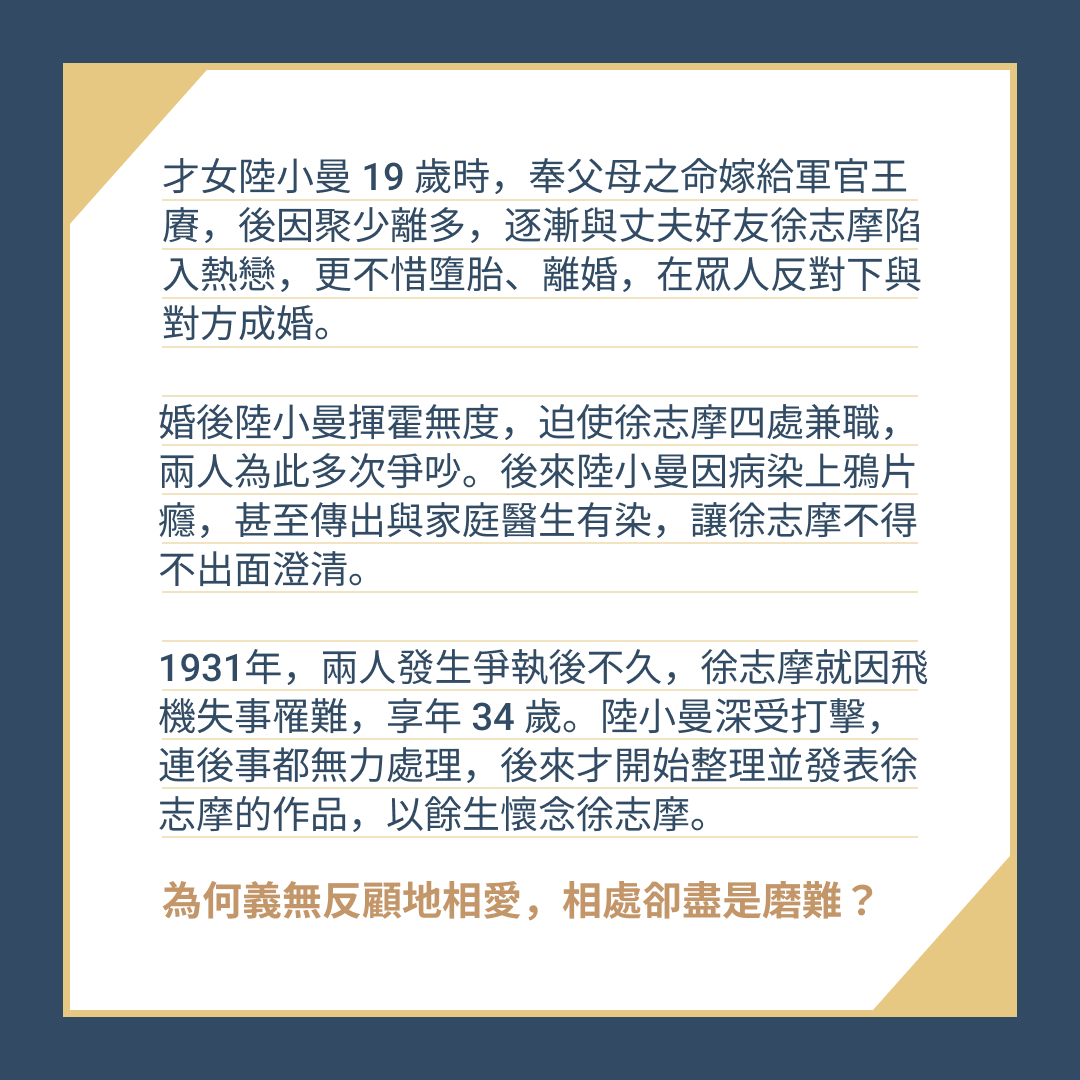 徐志摩跟陸小曼都很想被愛,但陸小曼得靠徐志摩得打七份工才養得起;而徐志摩明明已經陸小曼在一起,卻還是一直糾纏林徽因。