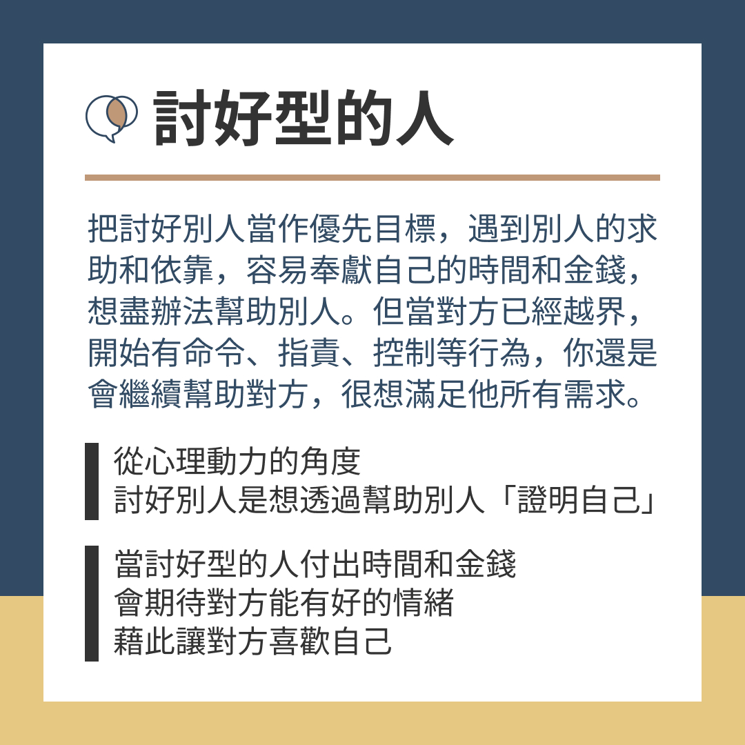 討好型:把討好別人當作優先目標,遇到別人的求助和依靠時,容易奉獻自己的時間和金錢,想盡辦法幫助別人,但當對方已經越過界限,開始有命令、指責、控制等行為,你還是會繼續幫助對方,很想滿足對方所有需求。