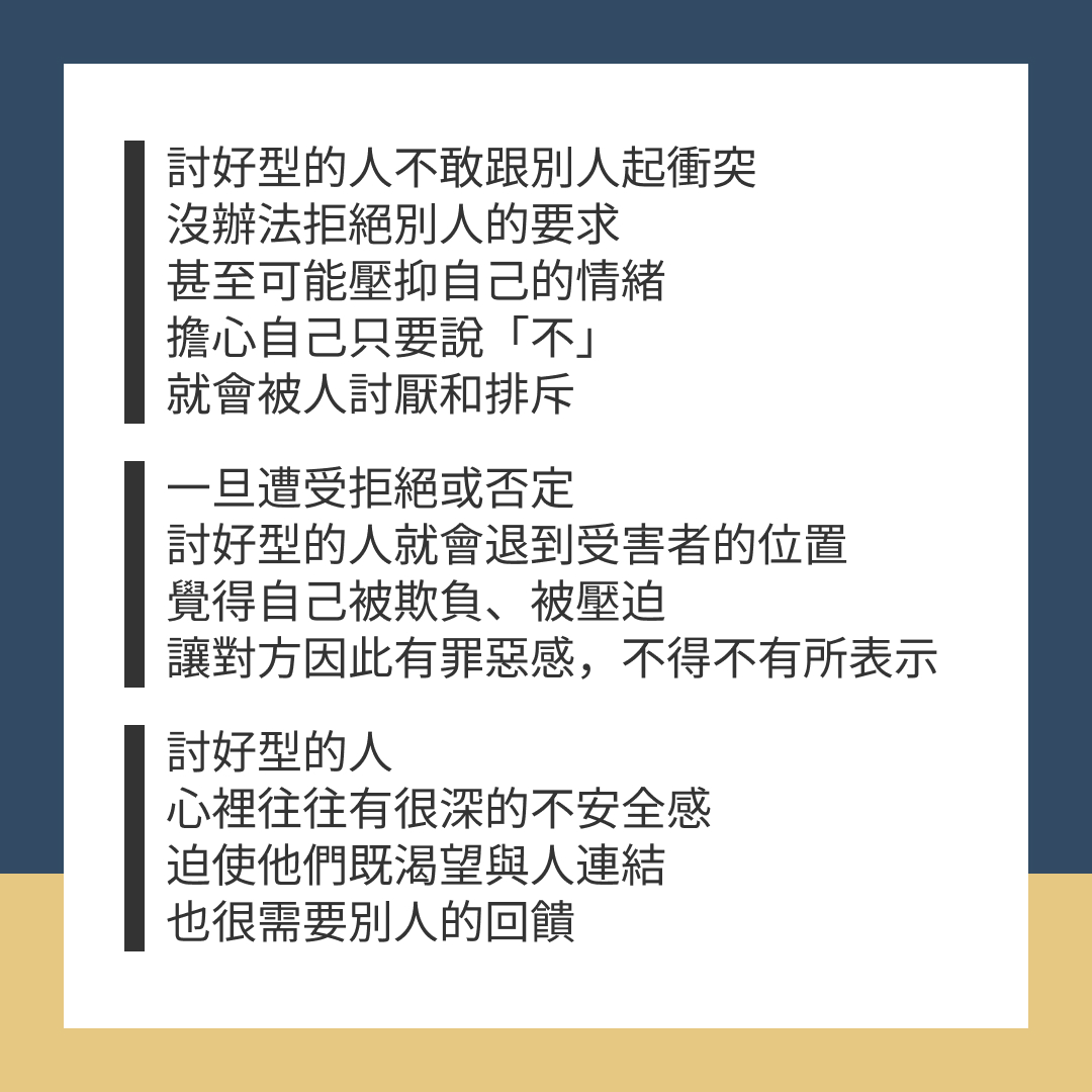 討好型的人不敢跟別人起衝突、沒辦法拒絕別人的要求,甚至可能壓抑自己的情緒,擔心自己只要說「不」,就會被人討厭和排斥