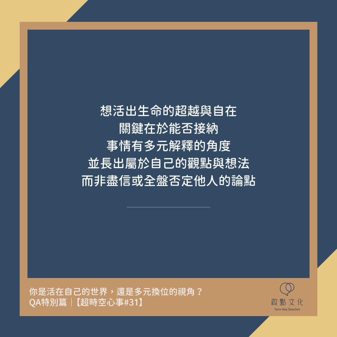→ 想活出生命的超越與自在,關鍵在於能否接納事情有多元解釋的角度,並長出屬於自己的觀點與想法,而非盡信或全盤否定他人的論點。