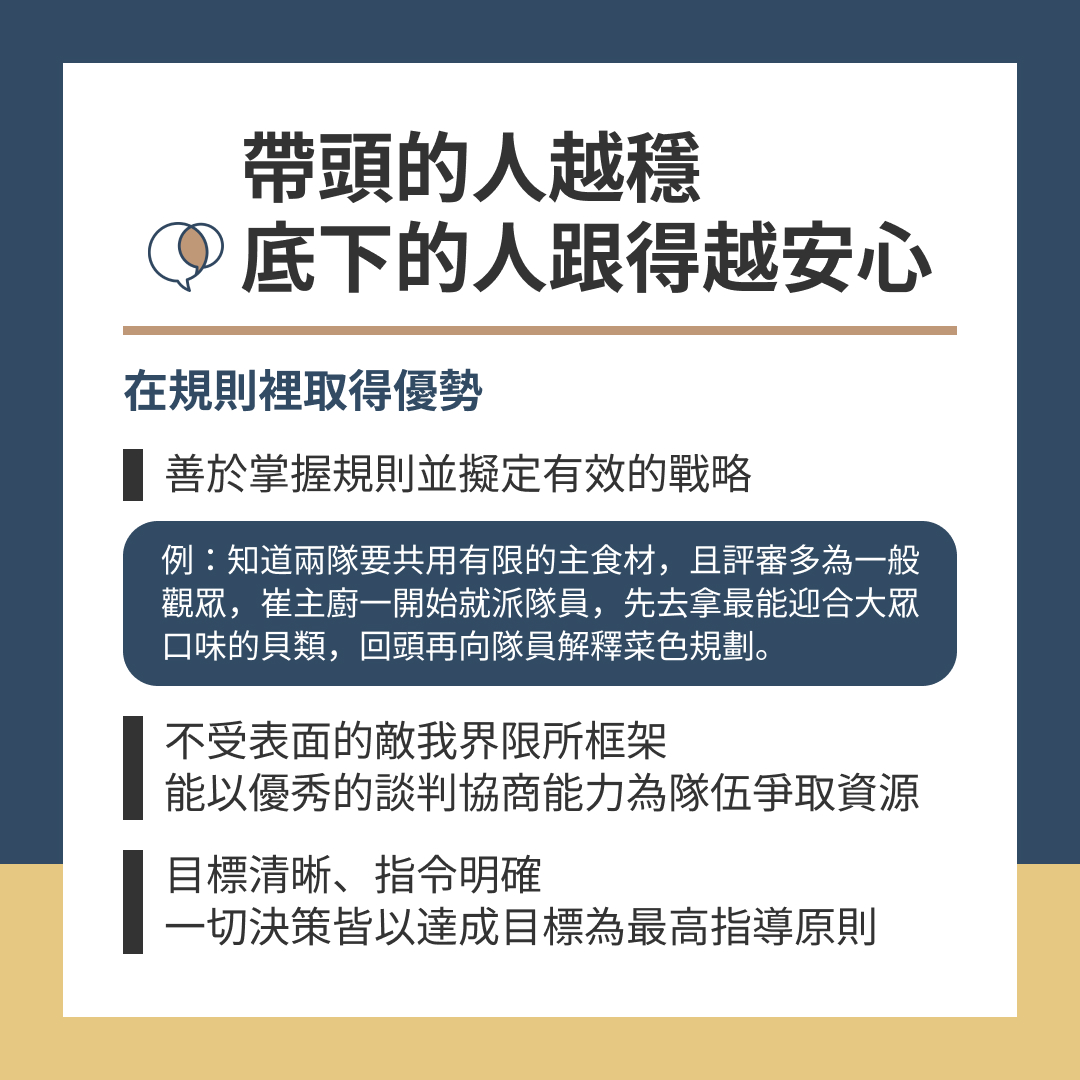 知道兩隊要共用有限的主食材,且評審多為一般觀眾,因此崔主廚一開始就派隊員,先去拿最能迎合大眾口味的貝類,回頭再向隊員解釋菜色的規劃。
