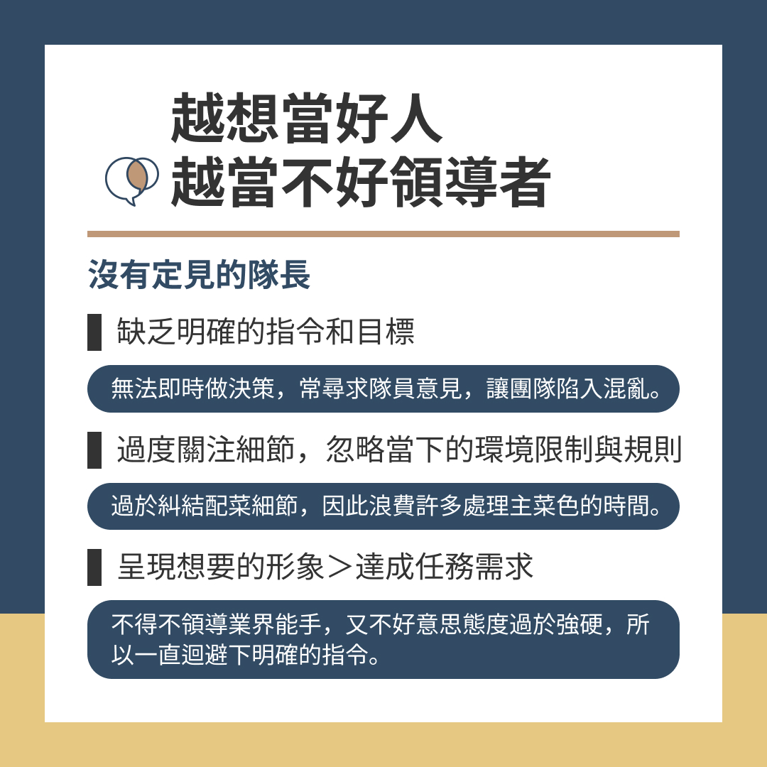 無法即時做決策,經常向隊員尋求意見,讓團隊陷入混亂。