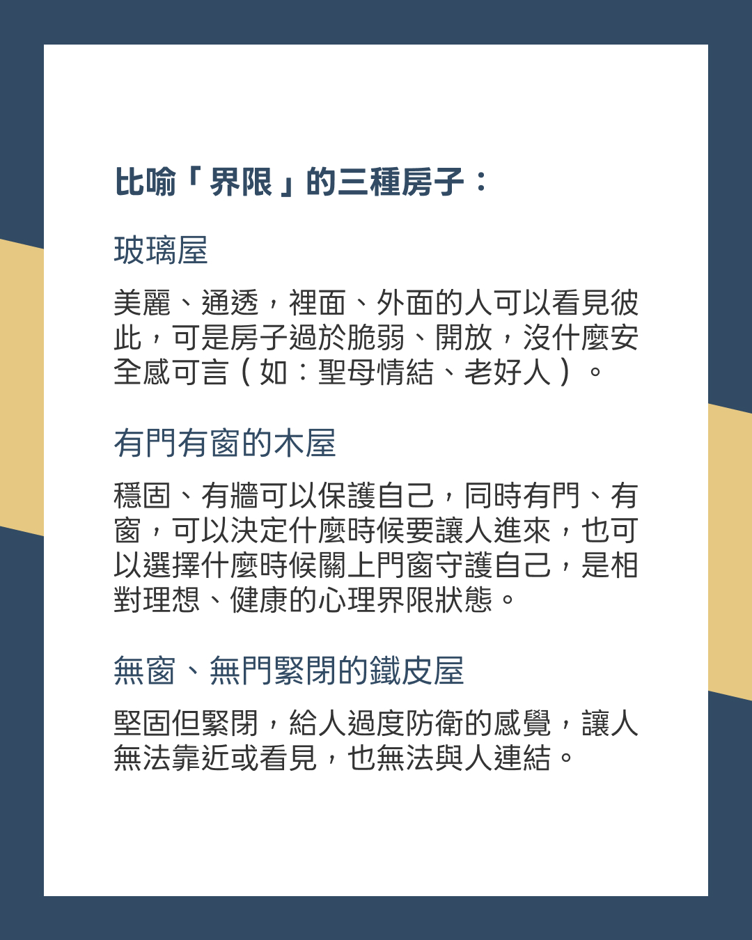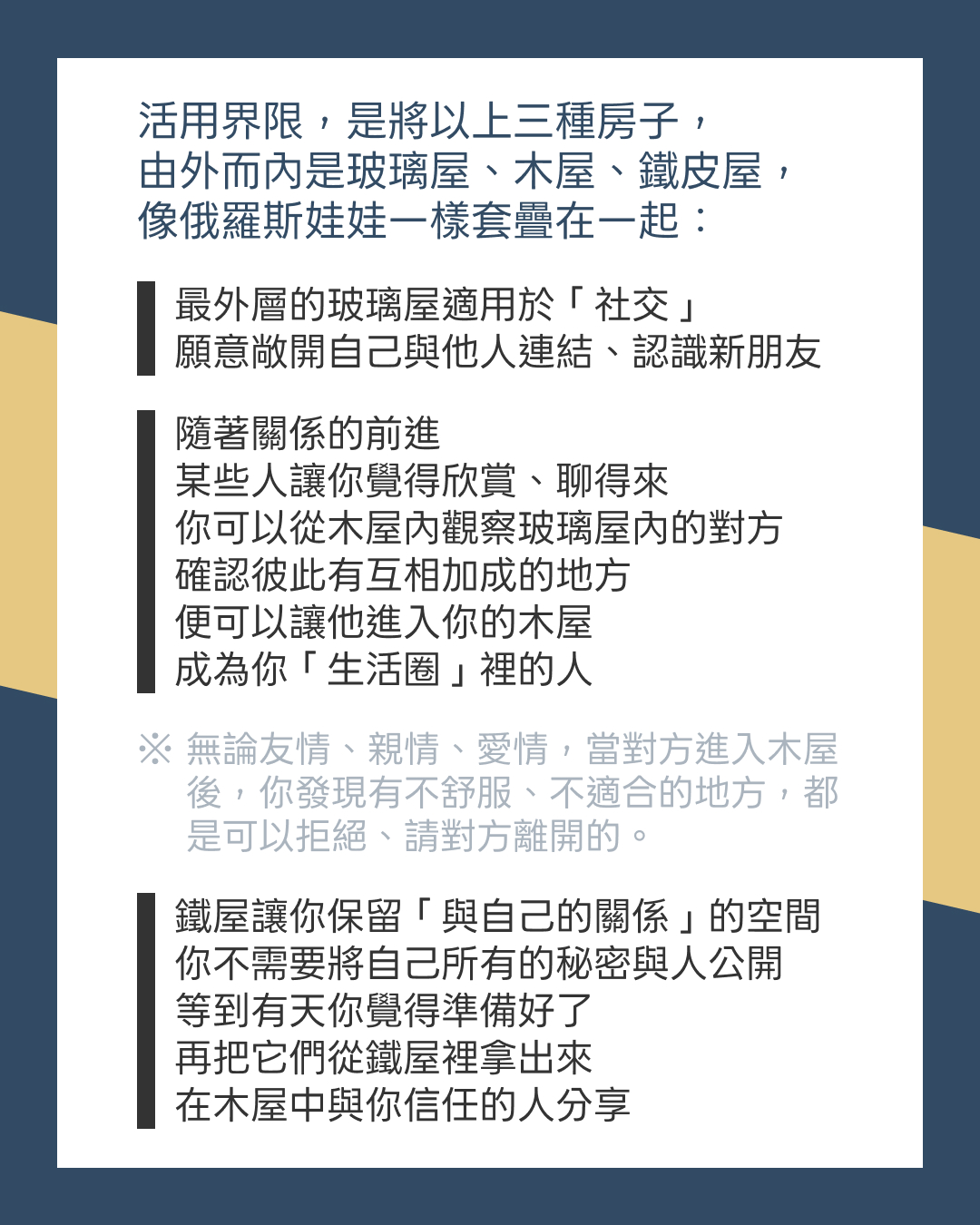 《自在關係的界限課》中,玉婷老師比喻「界限」可以分成三種房子: