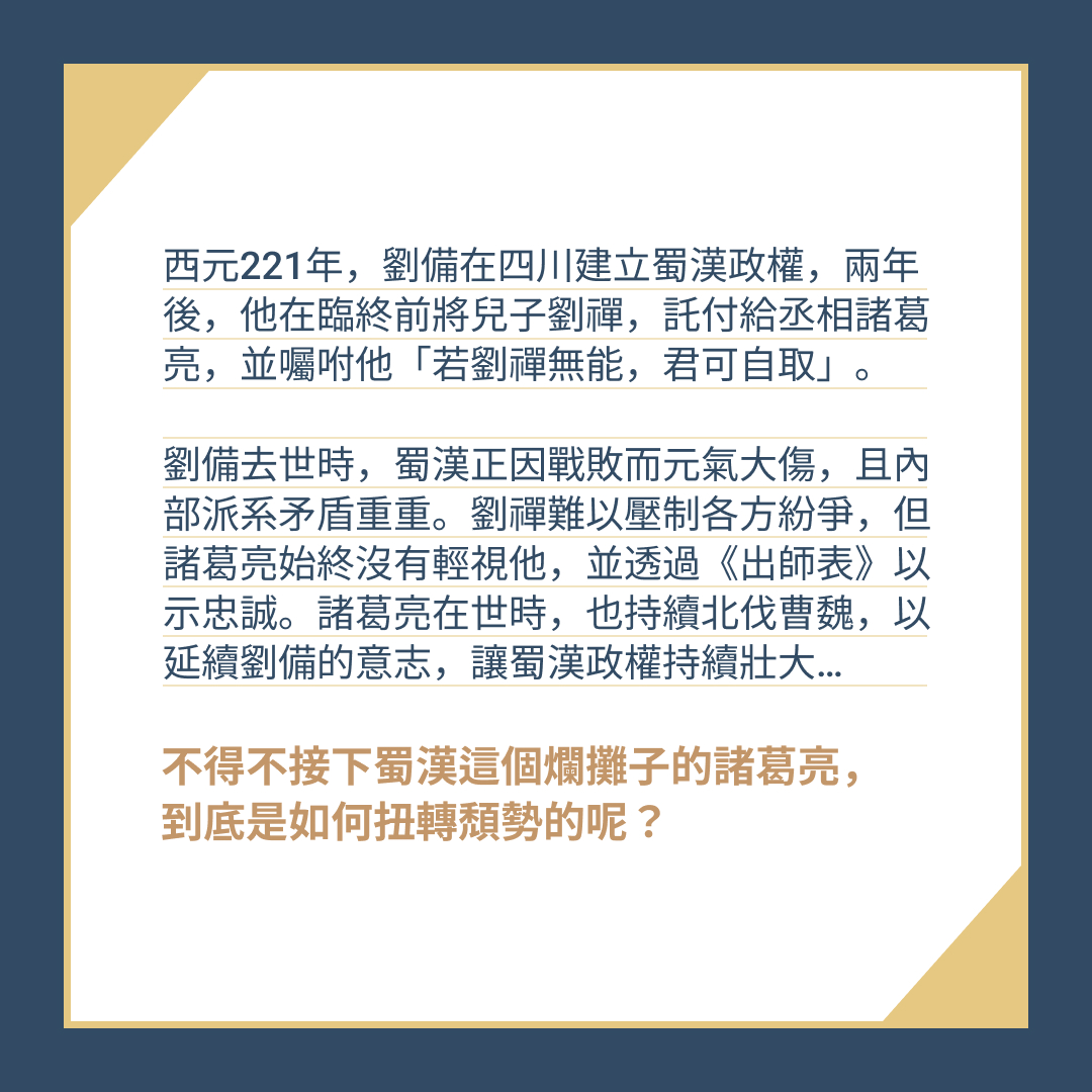 西元221年,曹魏政權篡奪漢室,導致漢朝滅亡。原本想幫漢朝平定天下的劉備被迫在四川稱帝,建立蜀漢政權。兩年後,劉備臨終前在白帝城,將17歲的兒子劉禪託付給丞相諸葛亮,並囑咐他「若劉禪無能,君可自取」。