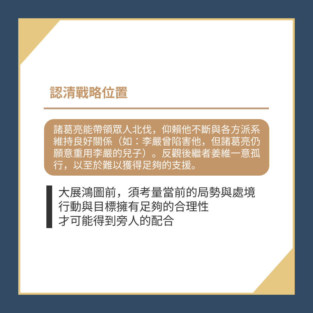諸葛亮能帶領眾人北伐,仰賴他不斷與各方派系維持良好關係(如:李嚴曾陷害他,但諸葛亮仍重用李嚴的兒子)。反觀後繼者姜維一意孤行,以至於難以獲得足夠的支援。
