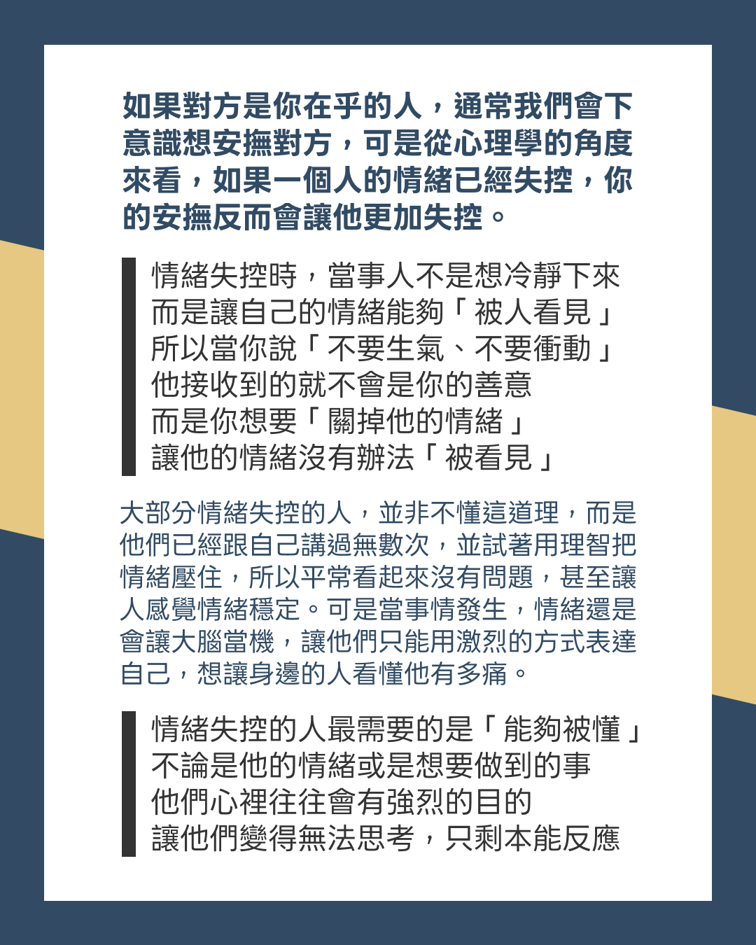 情緒失控時,當事人想要的不是冷靜下來,而是讓自己的情緒能夠「被人看見」,所以當你說「不要生氣、不要衝動」,他接收到的就不會是你的善意,而是你想要「關掉他的情緒」,讓他的情緒沒有辦法「被看見」