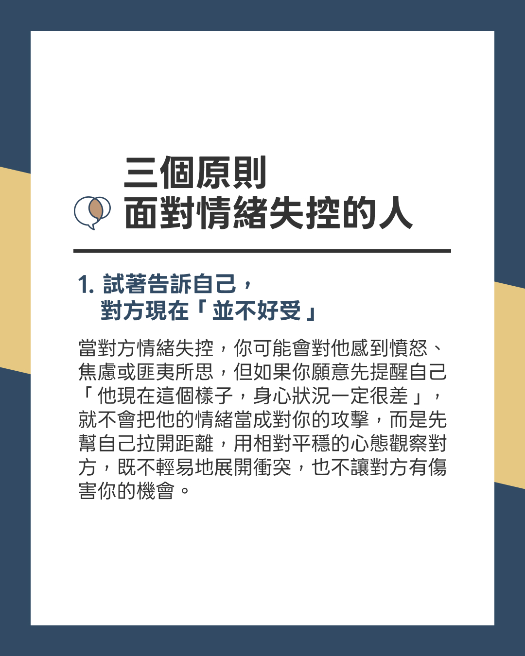 當對方情緒失控,你可能會對他感到憤怒、焦慮或匪夷所思,但如果你願意先提醒自己「他現在這個樣子,身心狀況一定很差」,就不會把他的情緒當成對你的攻擊,而是先幫自己拉開距離,用相對平穩的心態觀察對方,既不輕易地展開衝突,也不讓對方有傷害你的機會