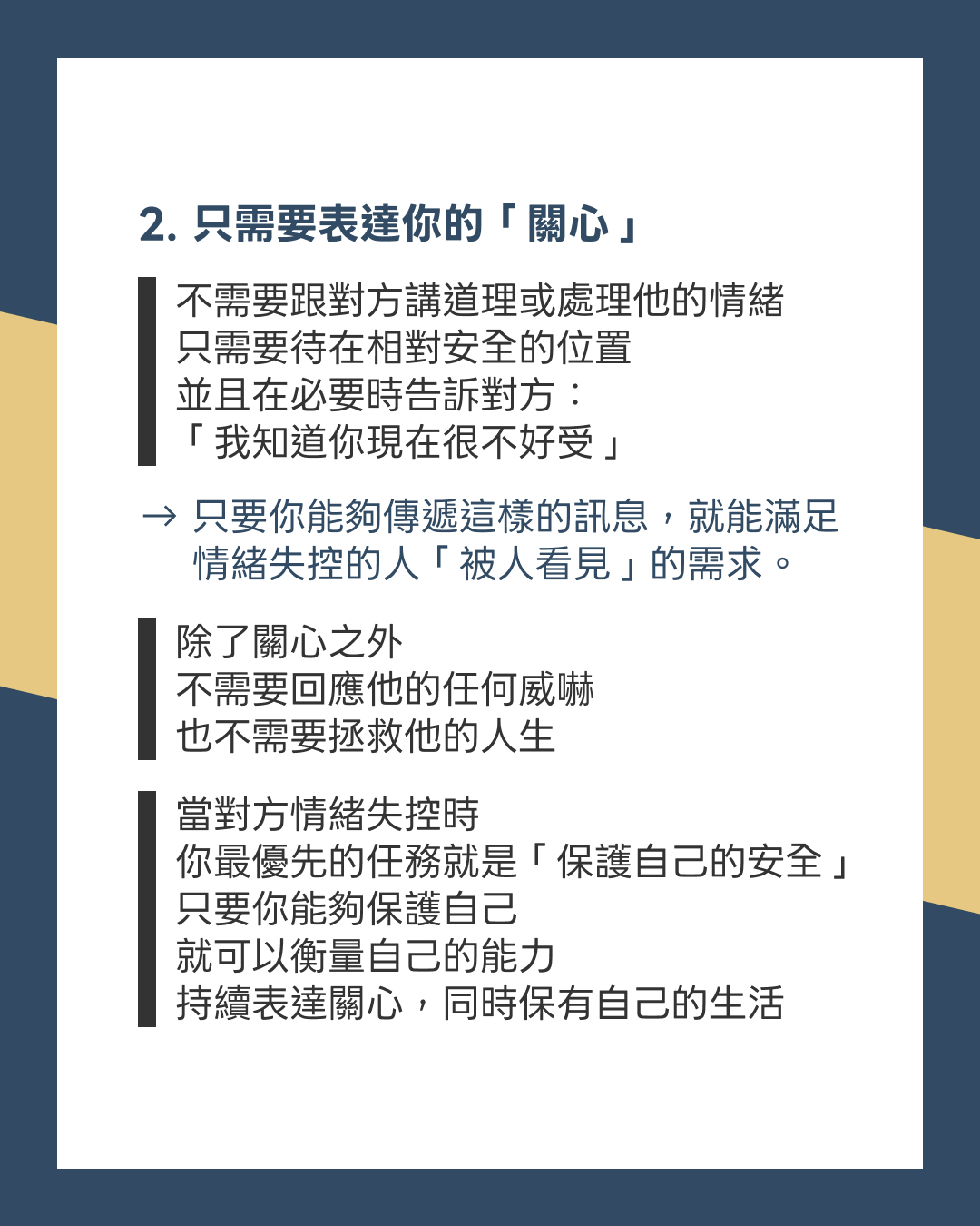 當對方情緒失控時,你最優先的任務就是「保護你自己的安全」,只要你能夠保護自己,就可以衡量自己的能力,持續向對方表達關心,同時保有自己的生活