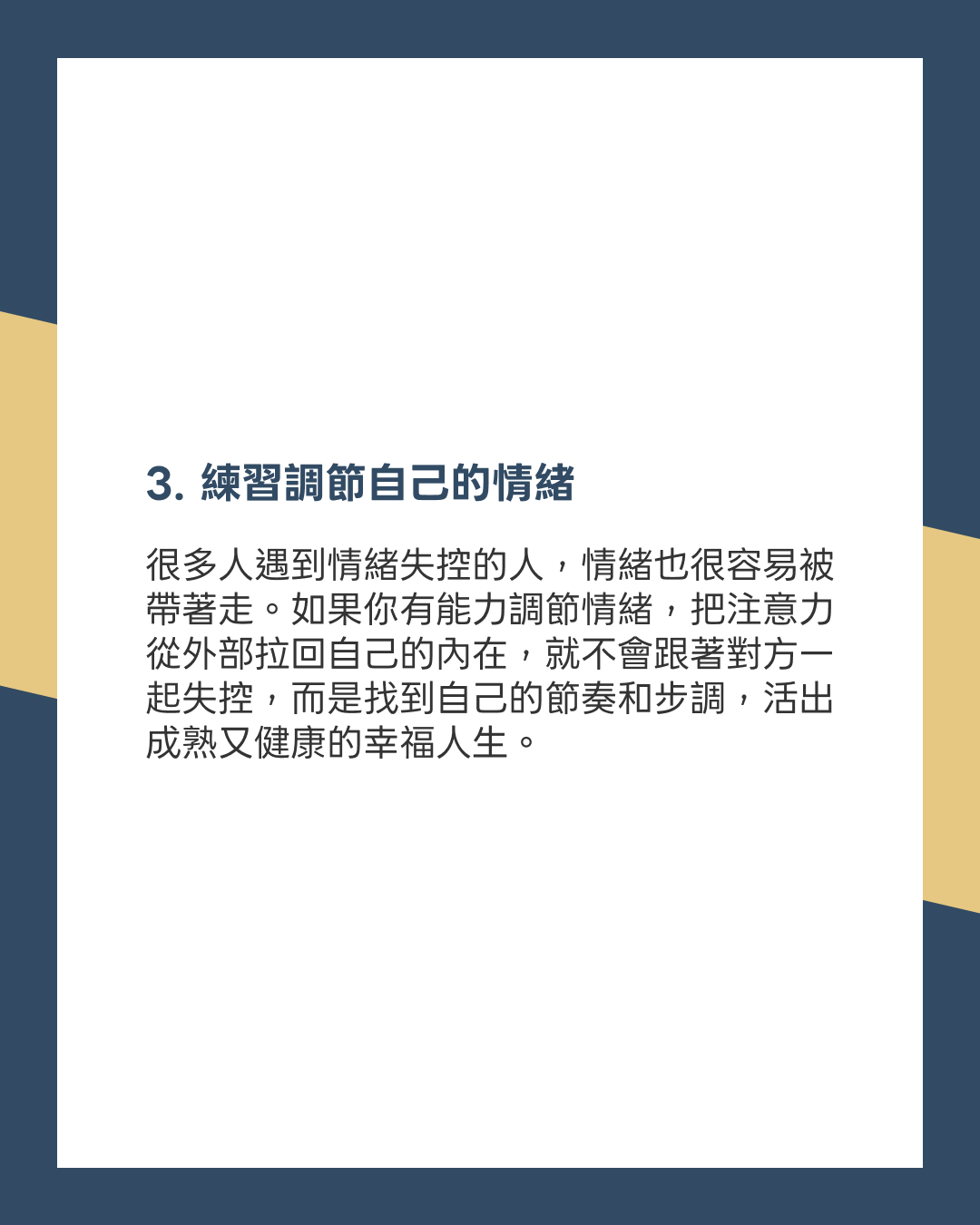 很多人遇到情緒失控的人,情緒也很容易被帶著走。如果你有能力調節情緒,透過「身體掃描」的方式,把注意力從外部拉回自己的內在,就不會跟著對方一起失控,而是找到自己的節奏和步調,活出成熟又健康的幸福人生